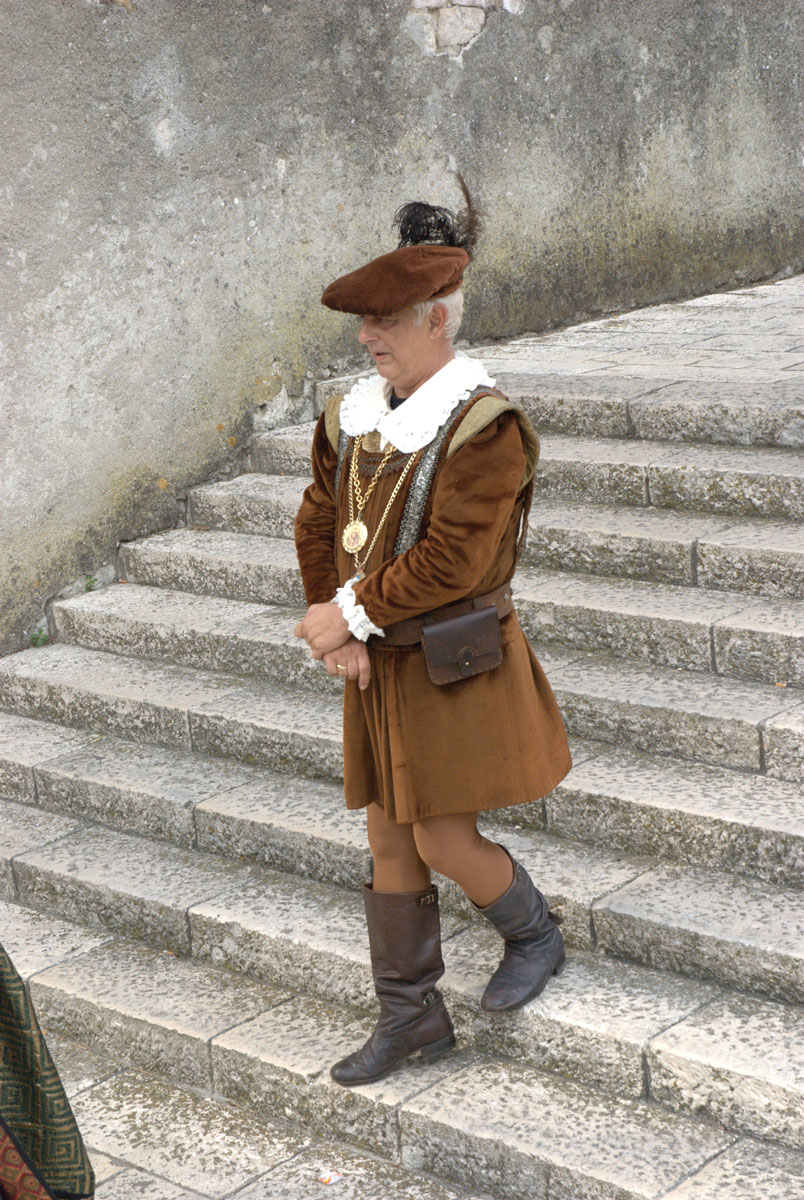 “Ugo, gotovo je, nema ništa od samostreličara, gradonačelnik je ljut i izgleda da odustaje od svega” Ugo je samo otovorio oči, pa je i on digao glas: “Ma kako, što, čekaj malo, što je sad..!?” Povukao me je za rukav u predsoblje gradonačelnikovog ureda, a ja mu kažem da ja ne idem unutra, pusti ga, ljut je ko ris, neće nas primiti “Dođi ovamo”, kaže mi potom Ugo i klekne na koljena pred vrata gradonačelnika sklopljenih ruku na molitvu. “Ajde, učini ovo i ti, odmah do mene”, reče mi tada. I ja sam kleknuo u isti položaj, a on je onda pokucao na vrata. Gradonačelnik je otvorio, a mi smo na koljenima ušetali u klancelariju