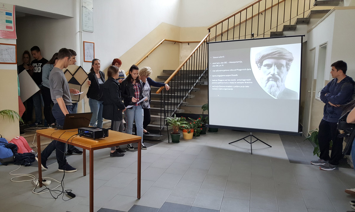 Učenici su proučili otkrića triju grčkih filozofa: Pitagore, Eratostena i Talesa (PET) te prezentirali njihove zasluge u raznim znanostima. Nakon kratkog izlaganja demonstrirali su praktičnu primjenu nekih njihovih otkrića. Izradili su Eratostenovo sito i izračunali opseg Zemlje uz pomoć štapa i sjene. Primijenivši Tales način mjerenja visine piramide izračunali su visinu spomenika Cosimu I. Mediciju u Firenzi. Poučili su nas Pitagorinom poučku koristeći princip jednakosti površina. Učenici su samostalno izradili powerpoint prezentacije i izumili pomagalo za mjerenje visine. Svoj doprinos projektu dao je i otac učenika Andra Bišića izradivši ploču kojom se uz pomoć morskog pijeska dokazuje Pitagorin poučak.