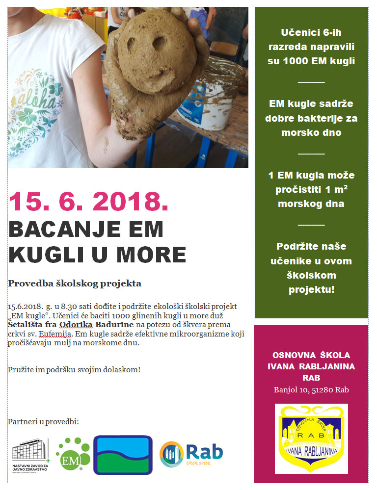 U petak 15. lipnja 2018. godine učenici OŠ Ivana Rabljanina Rab bacit će glinene kugle u more. Efektivni mikroorganizmi u glinenim kuglama nastanit će morsko dno te će svojim djelovanjem dodatno pročistiti mulj na samome morskom dnu. Sa proizvedenom količinom kugli planiramo pročistiti oko 1000 četvornih metara morskoga dna. U provedbi školskog projekta podršku nam pružaju djelatnici Nastavnog Zavoda za javno zdravstvo Ispostave Rab koji će analizirati uzorak mora prije i nakon bacanja kugli. Također podršku nam pružaju i djelatnici Efektivnih mikroorganizama originalna tehnologija Rijeka d.o.o. svojim savjetima i uputama. Partneri u provedbi također su i Turistička zajednica grada Raba kao i Komunalno društvo Dundovo d.o.o.