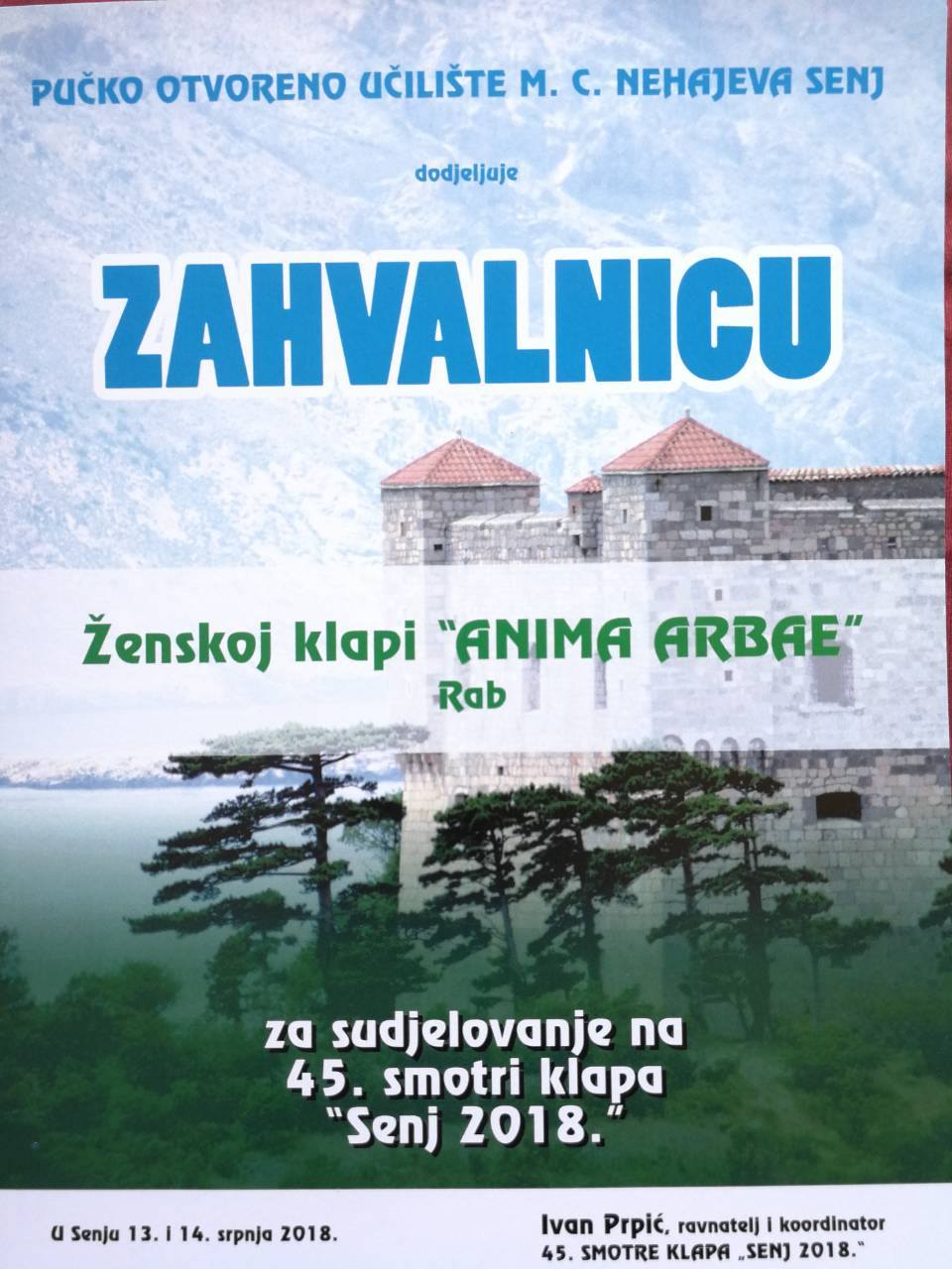 U uvodnom dijelu smotre saznali smo kako je Smotra klapa Senj nastala davne 1973. godine. Naime, 1971. godine gospodin Zvonko Benzia, glazbeni entuzijast, poveo je Senjsku klapu na Festival dalmatinskih klapa u Omiš, nakon čega je zaživjela senjska smotra klapa koja već dugih 45 godina čvrsto odolijeva svim burama. S tim u vezi, a u kontekstu gostovanja klape Anima Arbae na ovogodišnjoj senjskoj smotri, zanimljivo je spomenuti da je upravo gospodin Zvonko Benzia – samozatajnih zaljubljenik u glazbu i sklad klapskih glasova, zapravo djed naše rapske Senjkinje Larise Debelić. današnje članice klape Anima Arbae, koja je nekoć pjevala i u “Senjkinjama”.