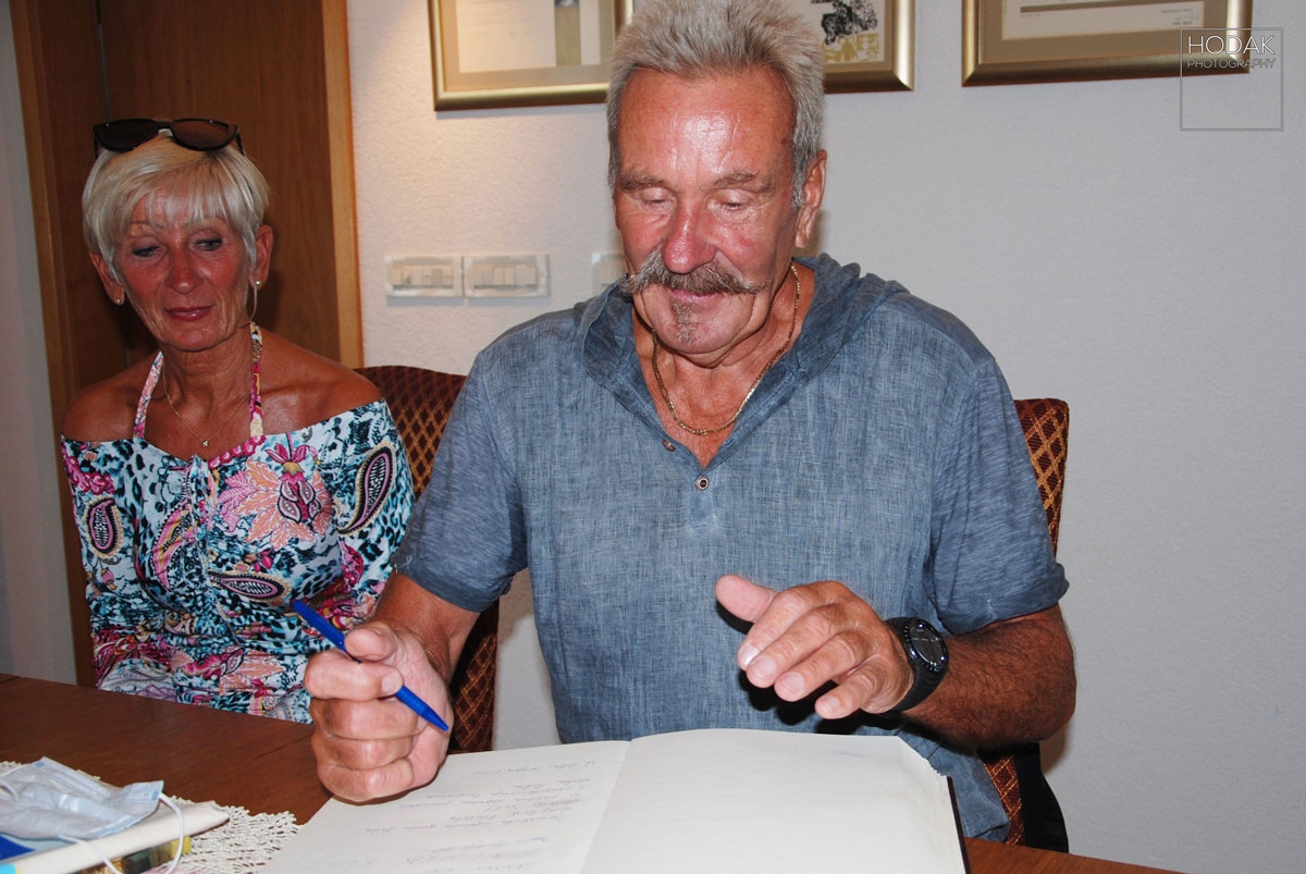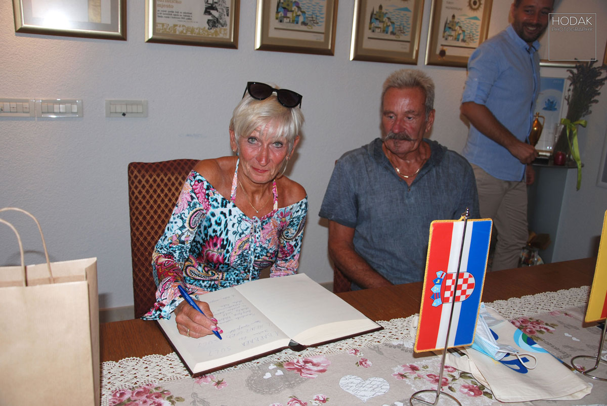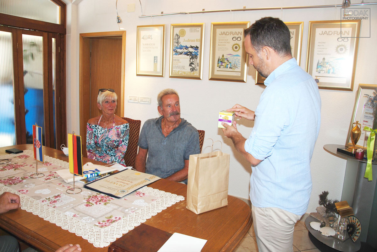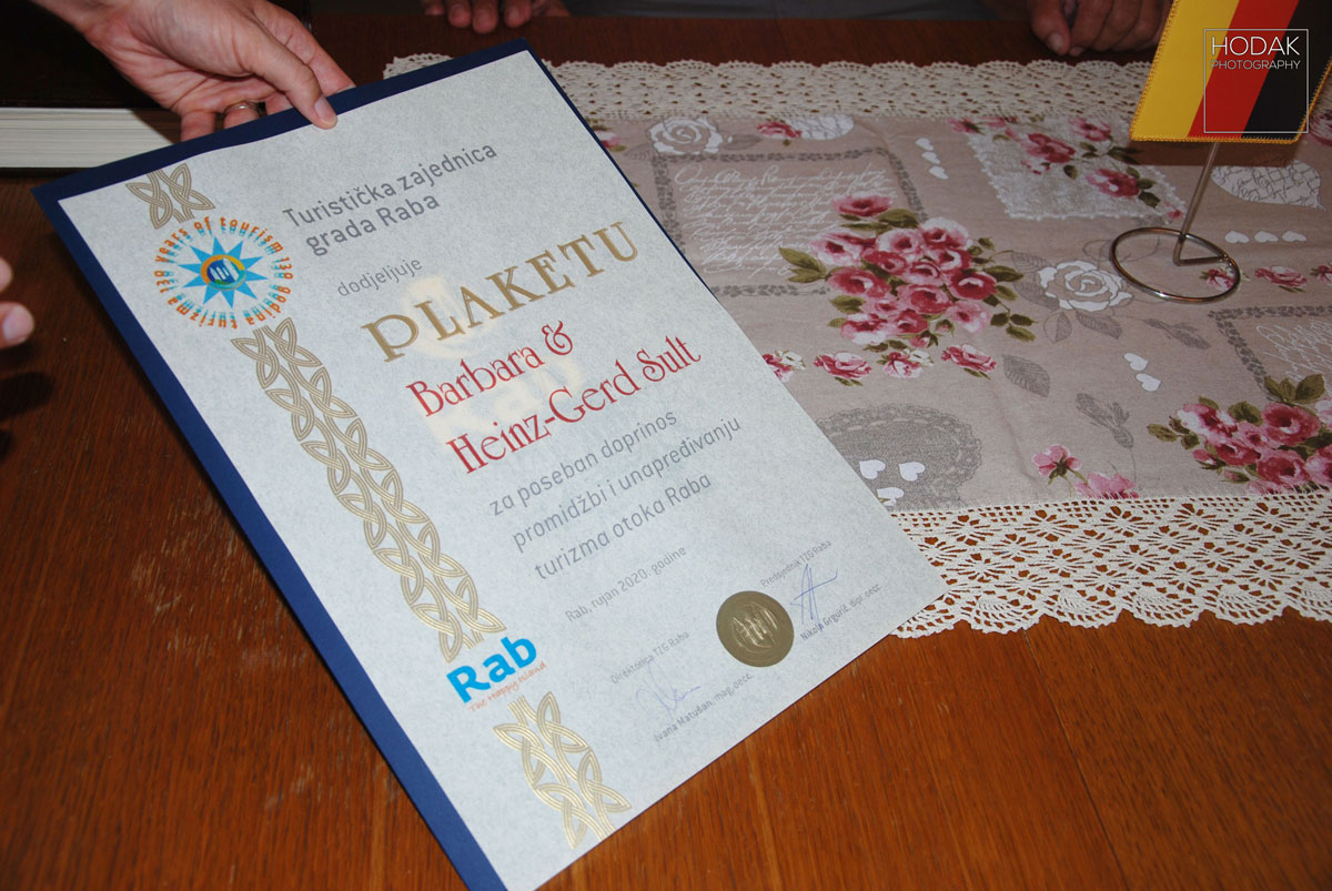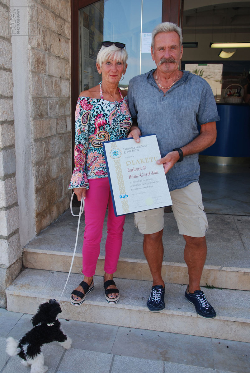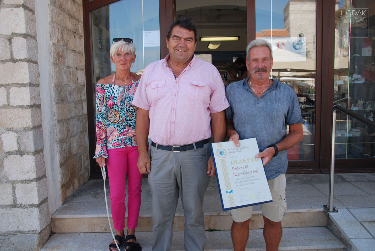 U znak zhahvalnosti za njihovih 45 godina vjernosti Rabu ovom je njemačkom bračnom paru u Uredu TZG Raba priređen mali svečani prijem na kojem im je Plaketu zahvale uz prigodne poklone uručio voditelj marketinga TZG Raba Luka Perčinić.
