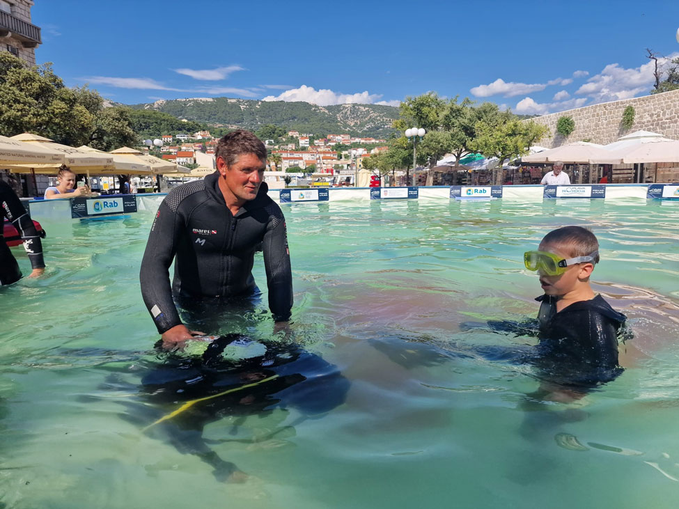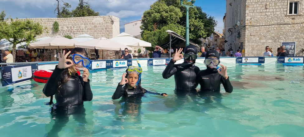 Na Trgu Sv. Kristofora tijekom vikenda bio je montiran 10 metarski montažni bazen Pogleda u plavo, a svi posjetitelji grada Raba imali su jedinstvenu priliku okušati se u ronjenju u potpuno kontroliranim i sigurnim uvjetima, s punom ronilačkom opremom uz stručno vodstvo instruktora ronjenja.