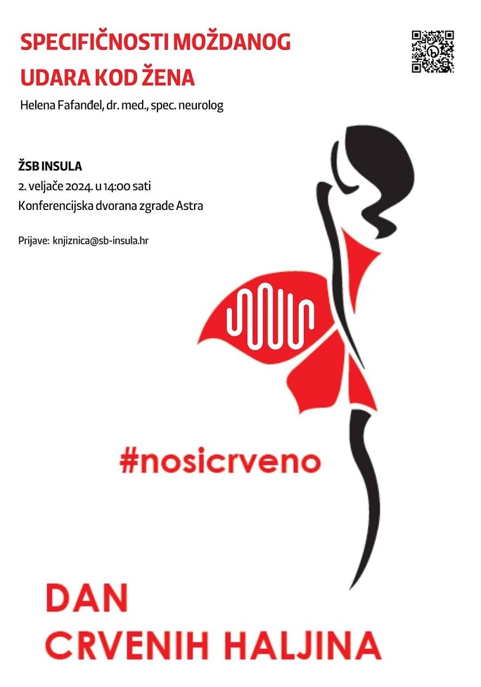 Kako bi se ukazalo na specifičnosti moždanog udara kod žena te važnost prevencije i skrbi o vlastitom zdravlju, povodom „Dana crvenih haljina“ Helena Fafanđel, dr. med., spec. neurolog, održat će edukativno predavanje namijenjeno zdravstvenim djelatnicima te široj javnosti. U svome izlaganju dr. Fafanđel će govoriti o čimbenicima rizika, vrstama i liječenju moždanog udara s posebnim osvrtom na žene.