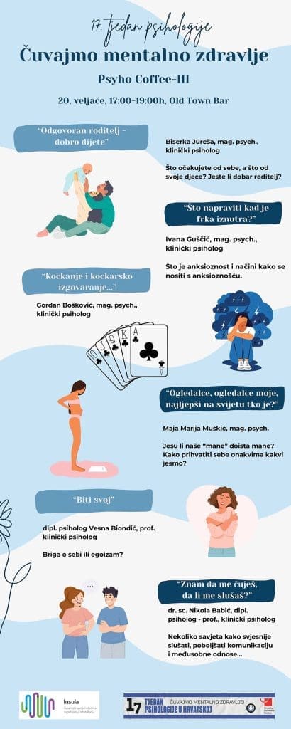 U sklopu 17. Tjedna psihologije u Hrvatskoj, koji će se održati od 19. do 25. veljače 2024. godine, šestero psihologa, zaposlenika ŽSB Insula, u utorak 20. veljače u od 17 do 19 sati u Old Town Baru održati sljedeće zanimljive radionice u sklopu trećeg rapskog “Psycho-Coffee”: