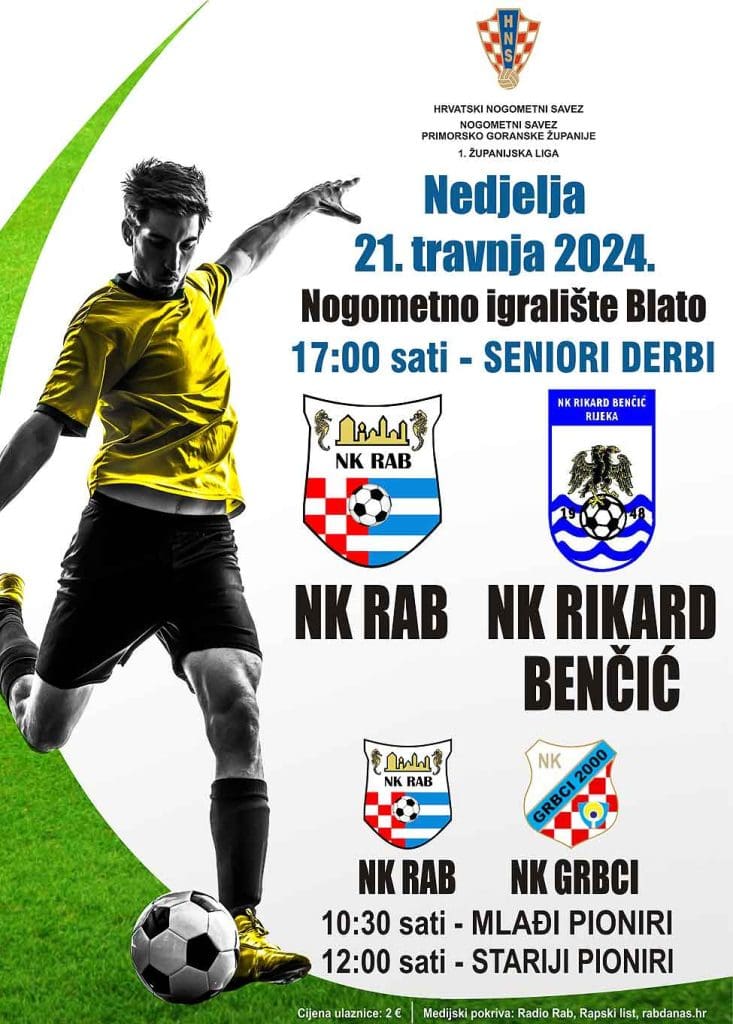 Mlađi pioniri NK Rab, koji su trenutno vodeća momčad svoje lige, igraju protiv drugoplasiranog sastava NK Grbci 2000, dok će rapski seniori ugostiti trenutno drugu momčad 1. Županijske nogometne lige PGŽ – NK Rikard Benčić.