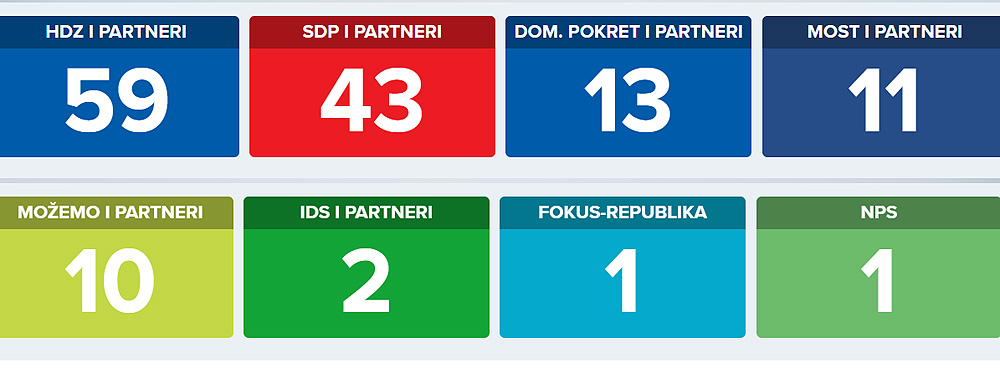 Prema izlaznim anketama koje su objavile vodeće nacionalne televizije u Hrvatskoj, HDZ s partnerima ima 59 mandata, SDP-ova koalicija je dobila 43 mandata, a Domovinski pokret s partnerima 13 mandata.