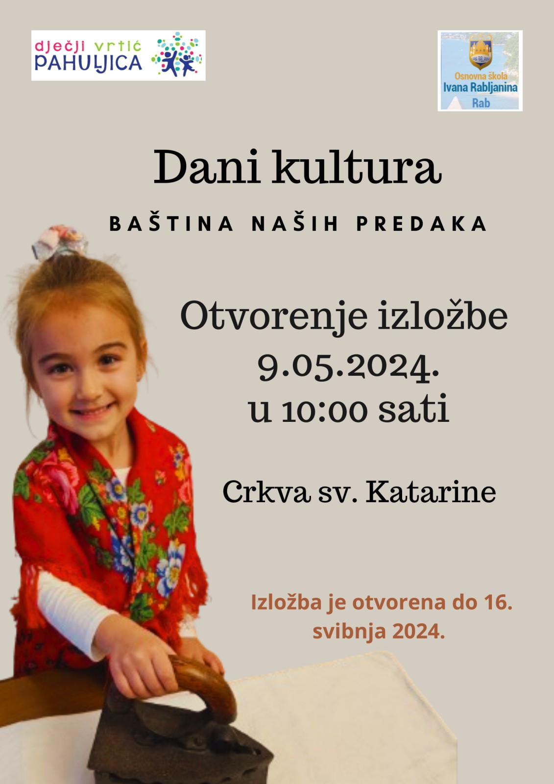 U istom tjednu će biti organizirano i otvorenje izložbe Dan kultura – baština naših predaka u Crkvi sv. Katarine u četvrtak 9. svibnja u 10.00 sati.