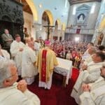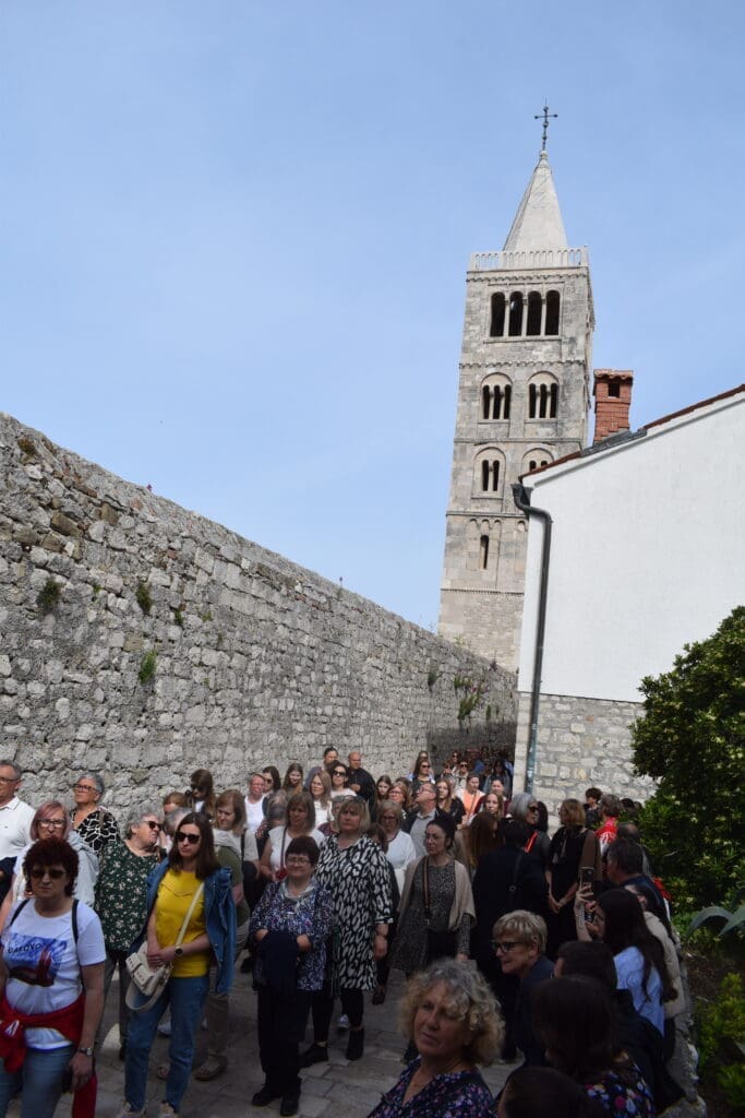 Pjevajući kroz grad, hodočasnici su ušli u Rapsku katedralu, u kojoj su sudjelovali u euharistijskom slavlju, a misu je, zajedno s rapskim svećenicima, predvodio biskup Ivica Petanjak.