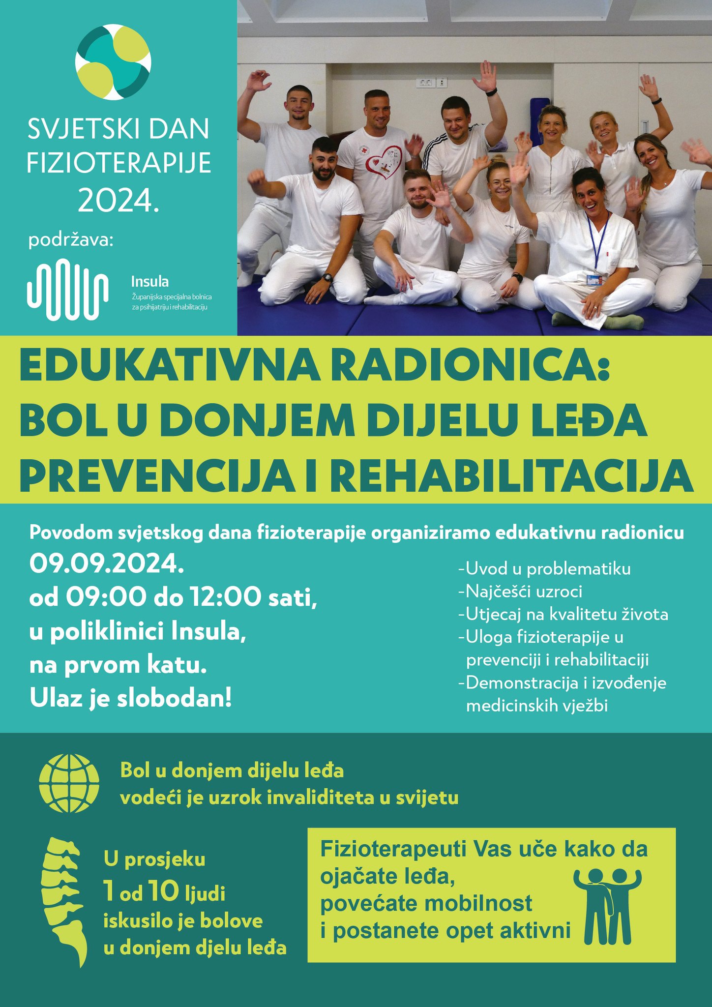 Sa svojim timom od 14 fizioterapeuta, ustanova će se ove godine uključiti u obilježavanje Svjetskog dana fizioterapije. Osluškujući potrebe njihovih pacijenata, konstantno uvode nove vještine i tehnologije, od kojih će neke ovom prilikom biti predstavljene u okviru prigodne radionice „Fizioterapija i bol u donjem dijelu leđa“. Radionica će se održati 9. rujna od 9 do 12 sati u Poliklinici Insula te iz Insule sve zainteresirane pozivaju da se pridruže bez prethodne najave!