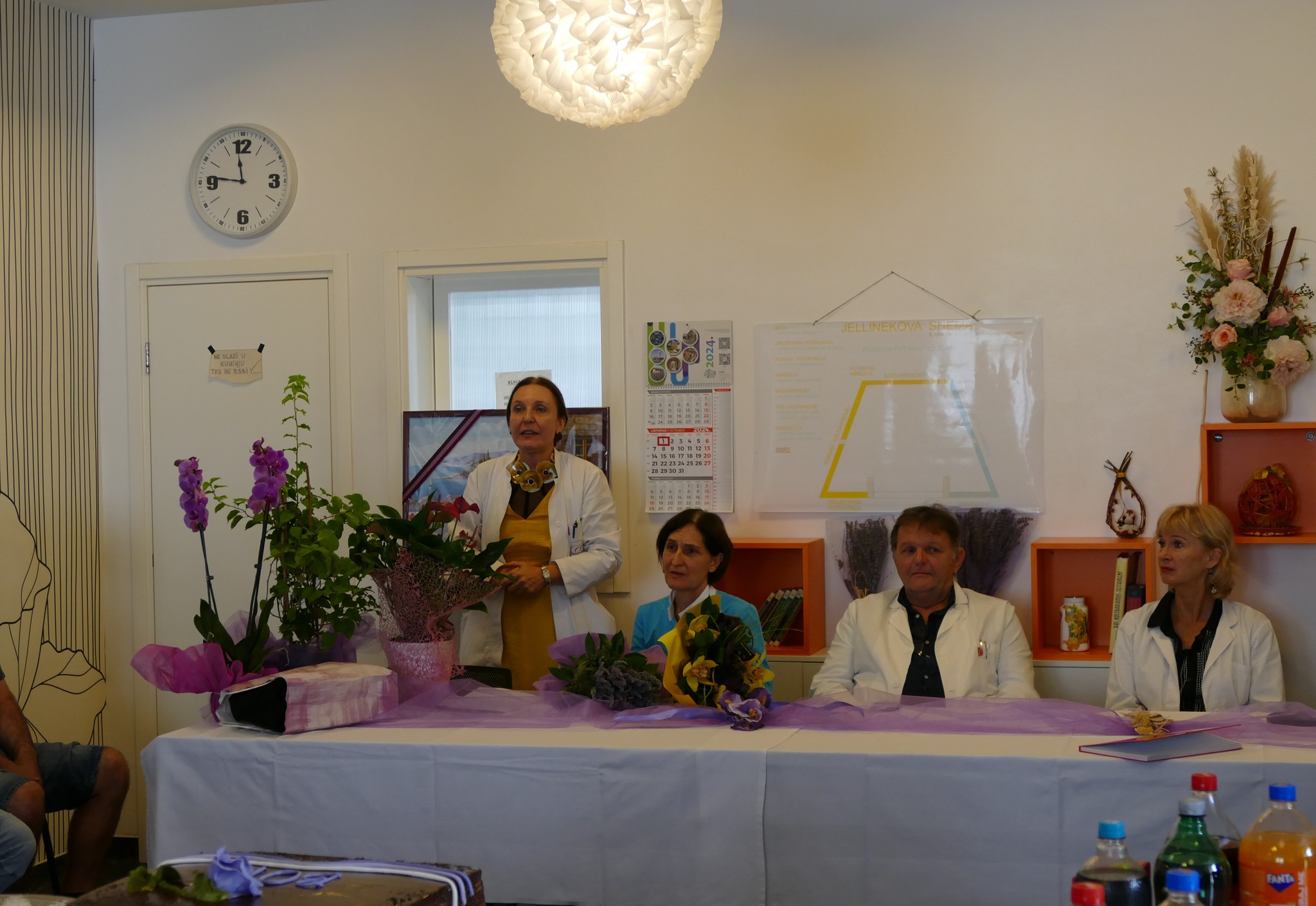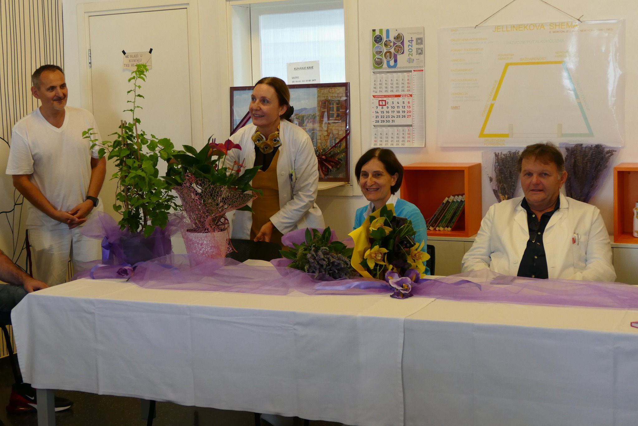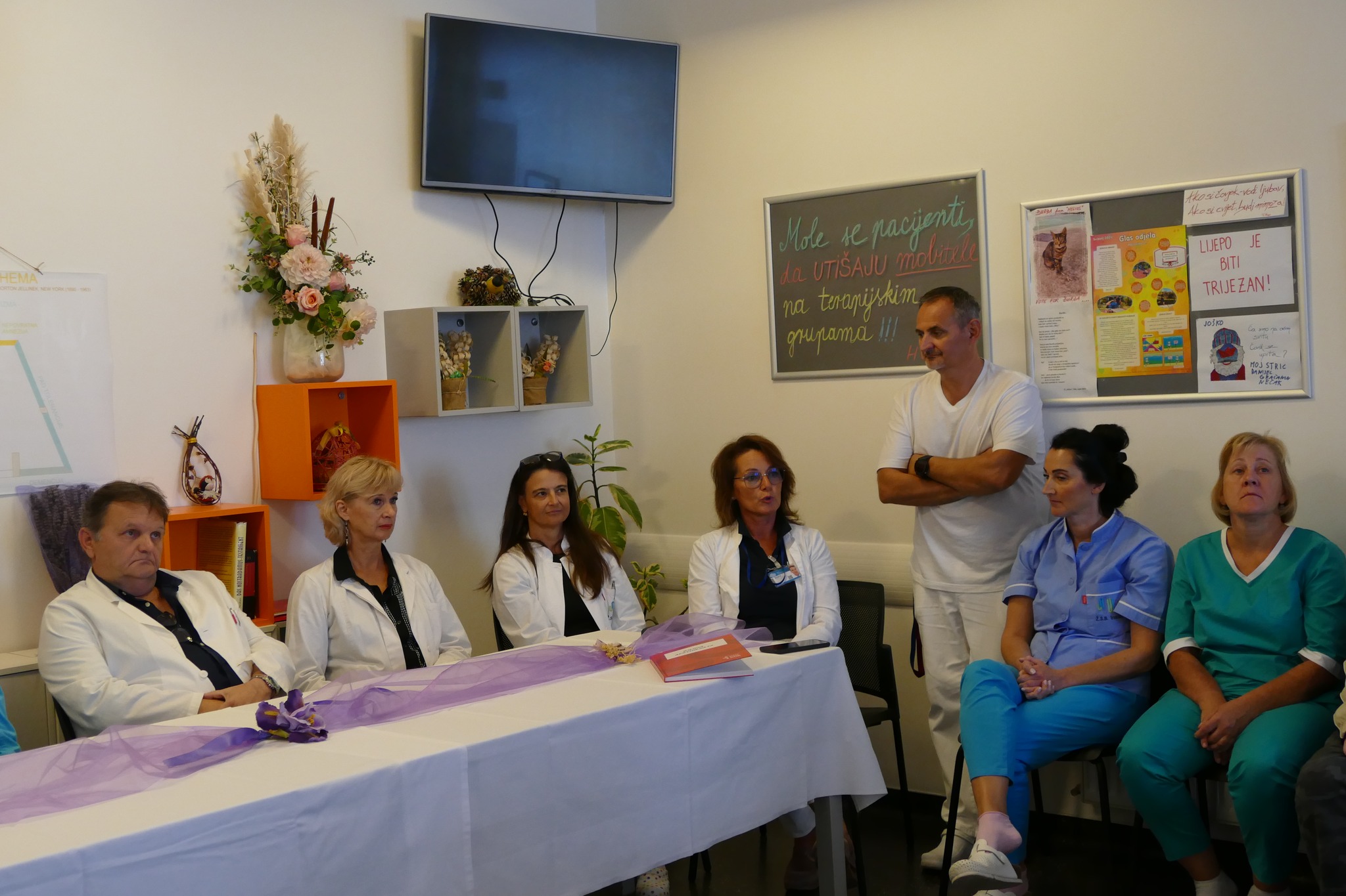 Uz zahvalu na suradnji i povjerenju, prisutnima su se pritom obratili i ostali članovi terapijskog tima: dugogodišnja glavna sestra Odjela Zorica Vujić, klinički psiholozi Vesna Biondić i Gordan Bošković, socijalna radnica Helena Grubišić te glavna sestra Bolnice Estera Paparić, koja je i sama dugi niz godina radila na ovome Odjelu. Dugotrajnim apstinentima, među kojima neki apstiniraju više od desetljeća, zatim su u vrlo emotivnom ozračju dodijeljene diplome. Jedan od njih pritom je istaknuo kako mu je ovo najteže stečena, ali najdraža diploma u životu. Na kraju sastanka voditeljici Odjela uručeno je cvijeće uz zahvale djelatnika, pacijenata i bivših pacijenata.