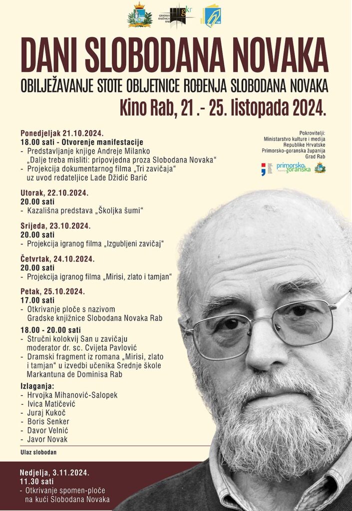 “Dani Slobodana Novaka” naziv je programa kojim će se od ponedjeljka, 21. listopada do petka, 25. listopada 2024. u Kinu Rab obilježiti stota obljetnica rođenja našeg slavnog književnika.