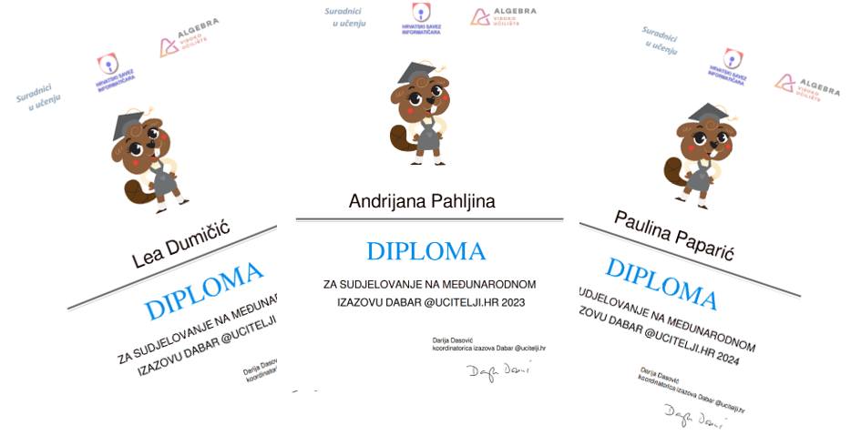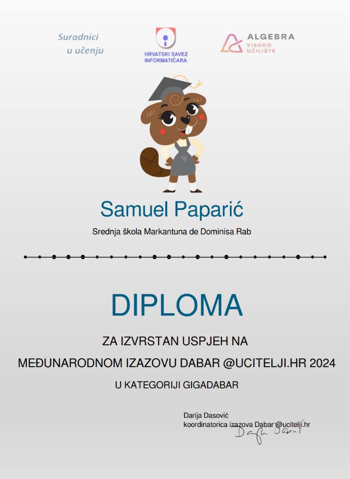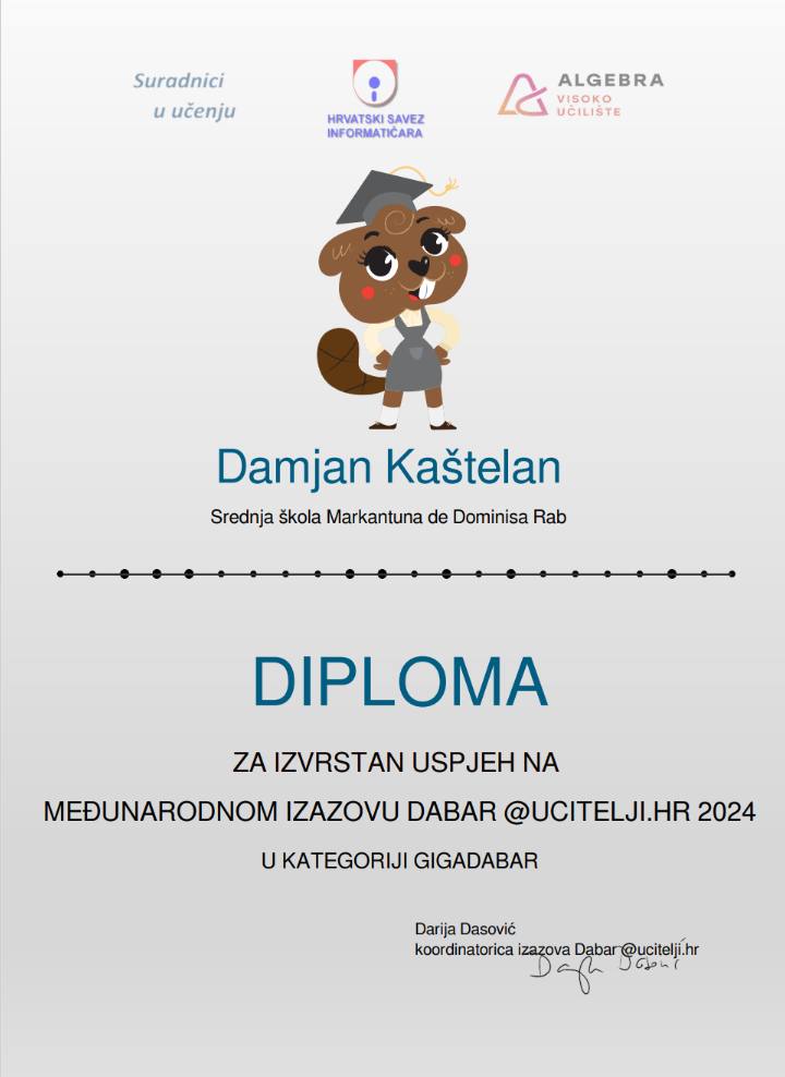 Već tradicionalno, i rapska srednja škola uključila se u ovo izazovno online natjecanje. Pod vodstvom profesorice informatike, Aleksandre Brmbota, ove godine u izazovu je sudjelovalo 19 učenika. Svi su dobili diplomu i značku za sudjelovanje. Među 10 posto najboljih u državi našla su i dva rapska “zlatna” dečka, Damjan Kaštelan i Samuel Paparić, učenici 3. razreda gimnazije te za svoj izvrstan rezultat dobili zlatnu diplomu i značku. A profesorica ih je nagradila i odličnom ocjenom.
