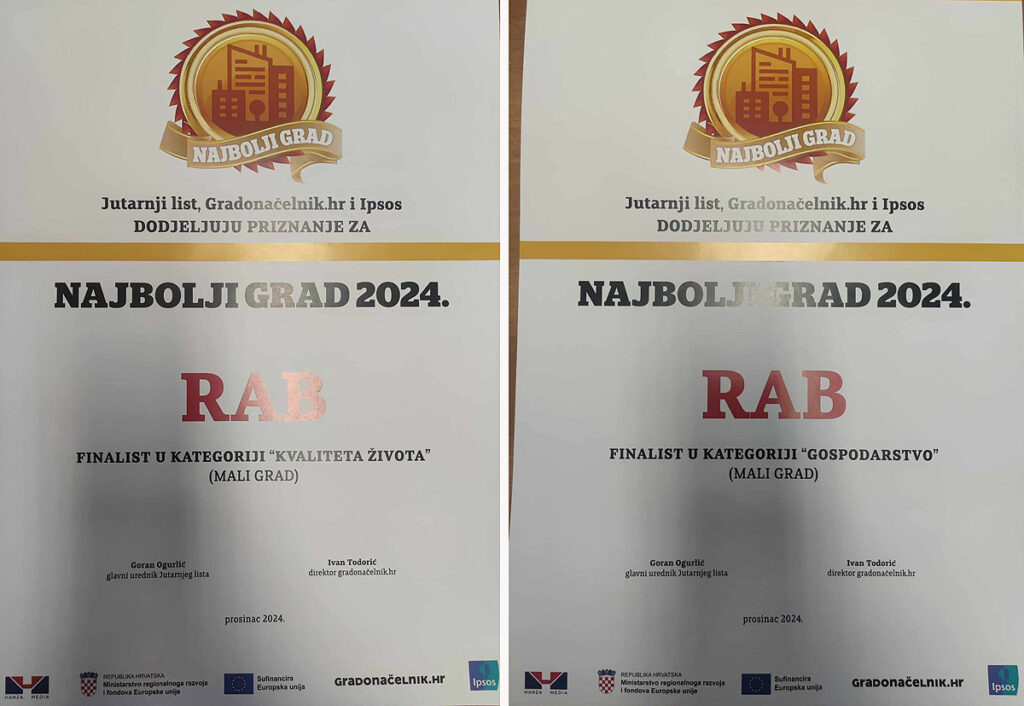 Grad Rab ponovno je među najboljima i po pitanju izbora za Najbolji grad u organizaciji Jutarnjeg lista i Gradonačelnik.hr-a tako što se po treći puta zaredom našao u finalu i to u kategorijama gospodarstva i kvalitete života – mali gradovi. Valja napomenuti kako se finalisti i pobjednici biraju temeljem službenih i javno dostupnih podataka te se u tu svrhu analizira trogodišnji period kako bi minimalizirali neuobičajena godišnja odstupanja i oscilacije.