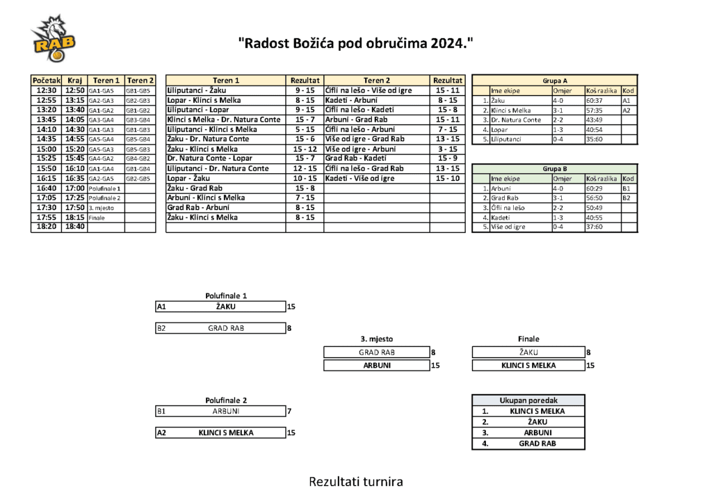 U finalu su “Klinci s Melka” rezultatom 15-8 pobijedili ekipu “Žaku” te osvojili premijerni, prvi humanitarni košarkaški turnir 3×3 “Radost Božića pod obručima 2024.”. U utakmici za treće mjesto broncu su osvojili “Arbuni” pobjedom nad ekipom “Grad Rab”, također rezultatom 15-8.
