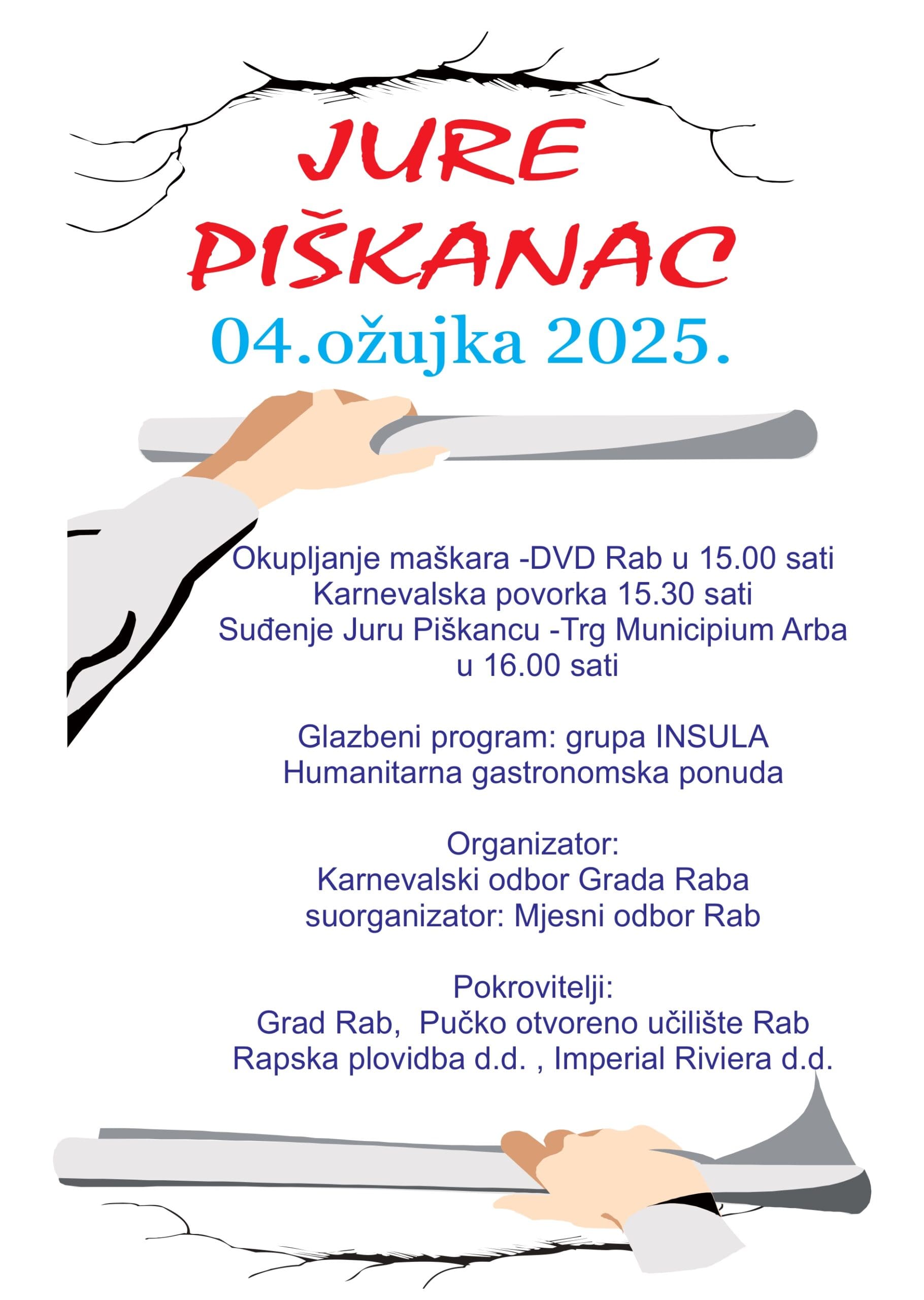 Okupljanje maškara zakazano je za 15:00 sati kod DVD-a Rab, nakon čega će u 15:30 sati krenuti vesela karnevalska povorka. Vrhunac događanja, suđenje Juru Piškancu, održat će se u 16:00 sati.