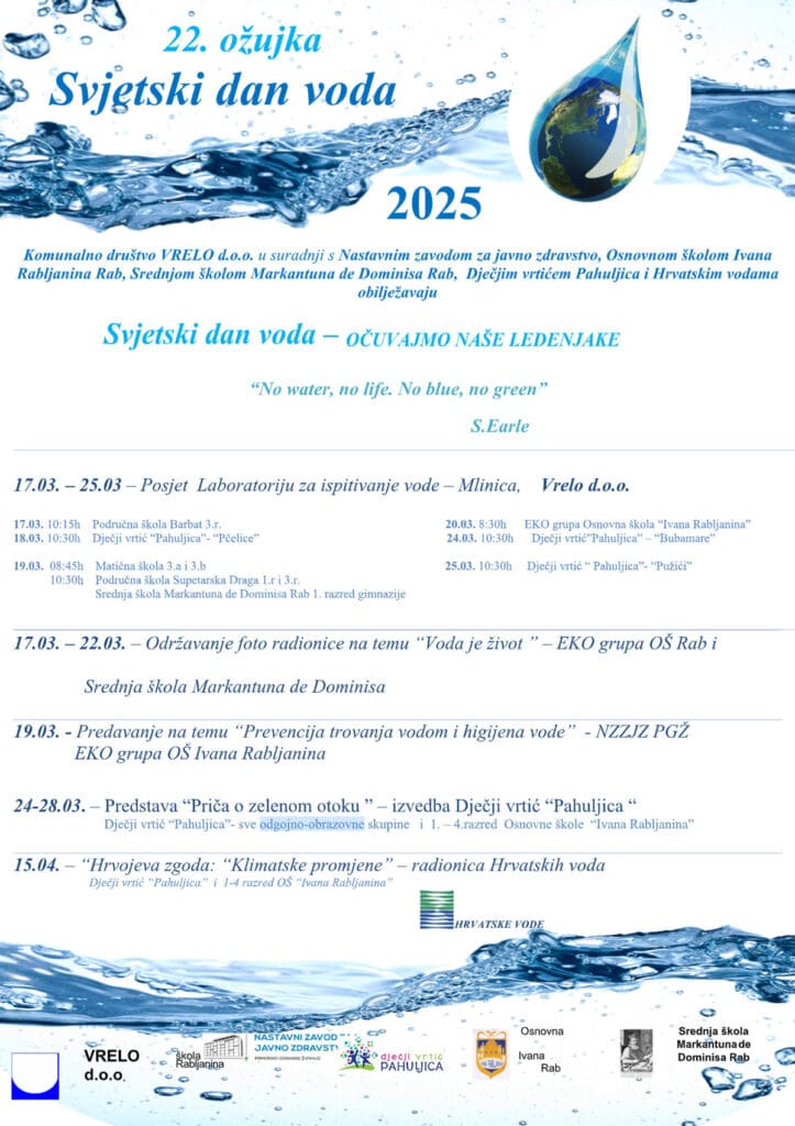 Komunalno društvo VRELO d.o.o. u suradnji s Nastavnim zavodom za javno zdravstvo, Osnovnom školom Ivana Rabljanina Rab, Srednjom školom Markantuna de Dominisa Rab, Dječjim vrtićem Pahuljica i Hrvatskim vodama obilježavaju Svjetski dan voda bogatim programom koji možete pogledati na plakatu: