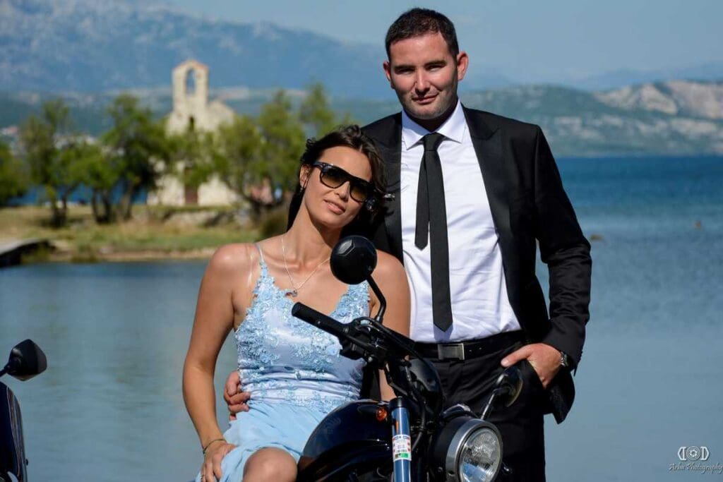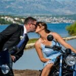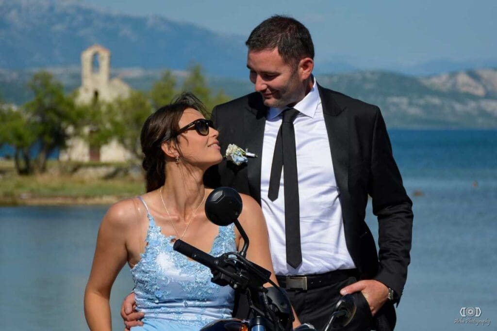 Stižemo na parking ispred plaže i još nismo ni stali, a prema nama već prilaze neki ljudi u odijelima, muškarac i žena… Skidam kacigu a oni uzbuđeno pitaju: “Oprostite, mogu li mladenci napraviti par snimki na vašim motorima?”.