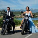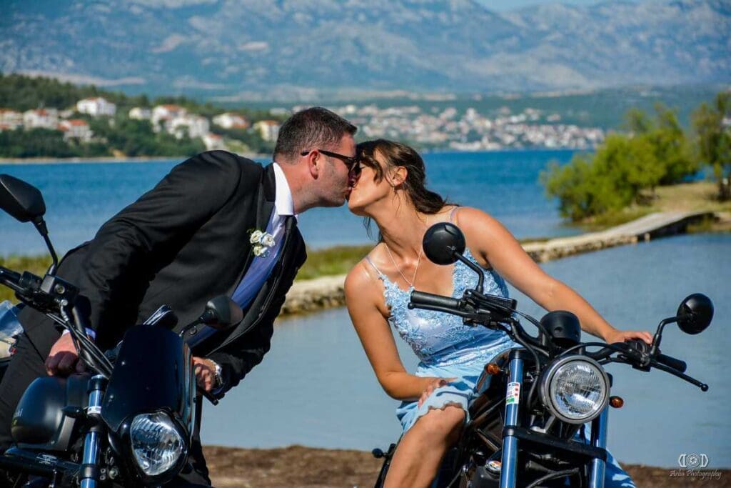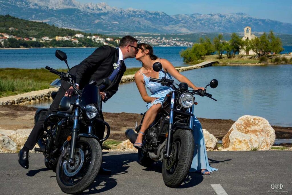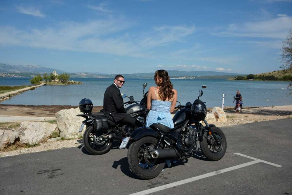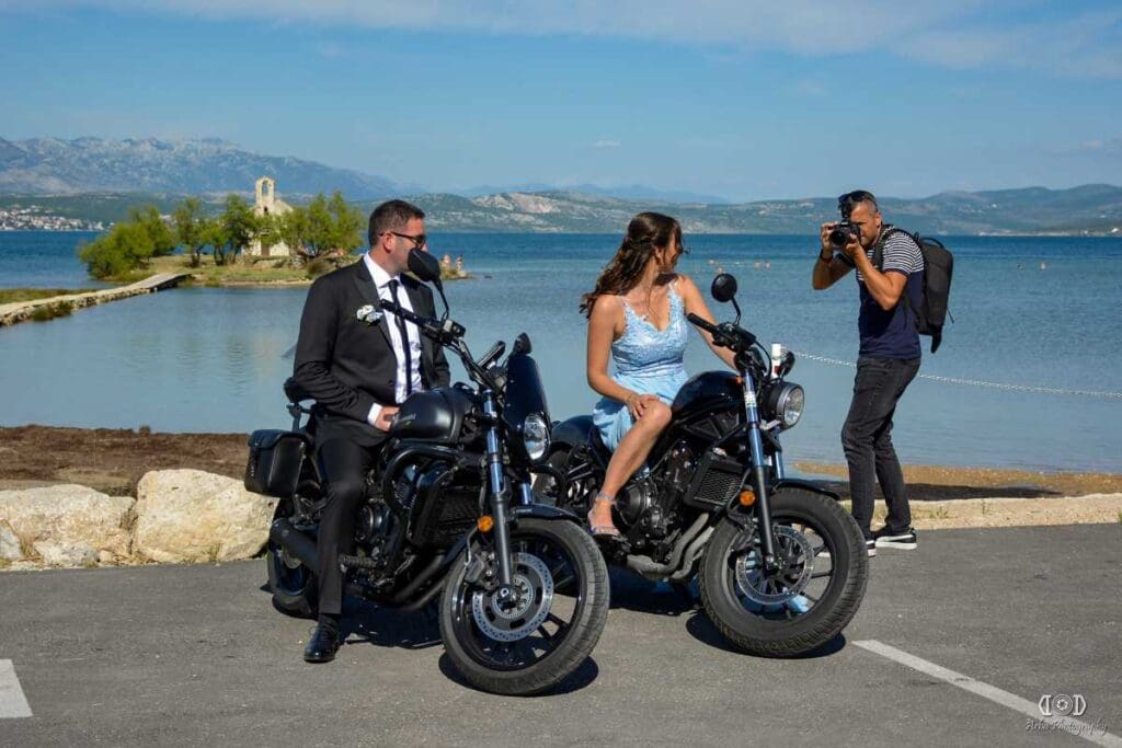 Mladenka kao da je sišla s modne piste, izgleda prekrasno na motoru, a osim prirodne ljepote koja ju krasi, kao da je rođena na ovoj Hondi Rebel! Mladoženja, visok momak, bori se sa Kawasaki Vulcanom, ali ide i njemu dobro, snalazi se. Aparati škljocaju, mladenci se uživili u photoshooting, a znatiželjni turisti zastajkuju sa strane i promatraju što se događa.