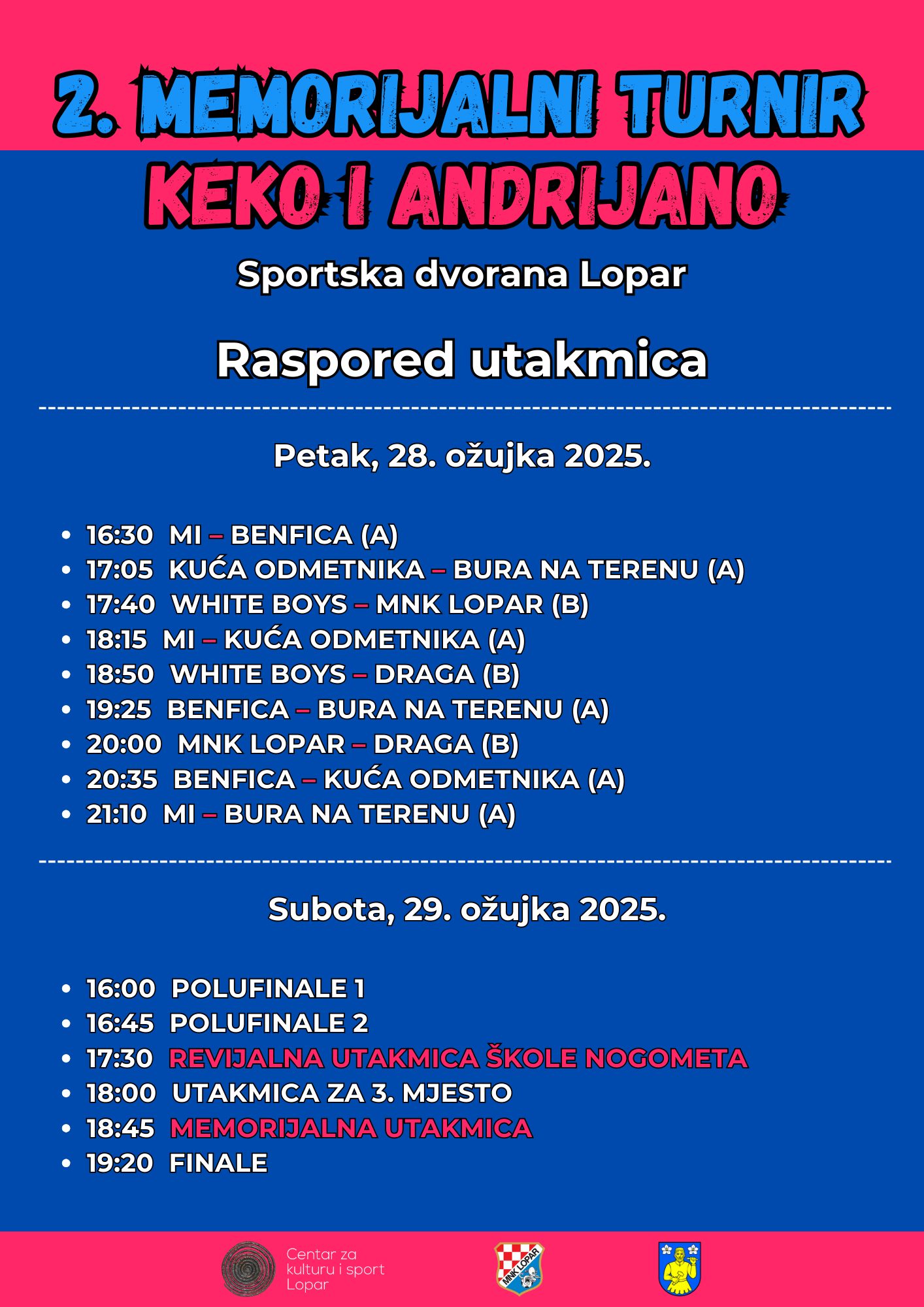 Turnir se održava u znak sjećanja na Keka i Andrijana, a osim sportskog dijela, posjetitelji će moći uživati u pravoj navijačkoj atmosferi i zajedništvu. Organizatori iz Centra za kulturu i sport Lopar najavljuju dinamične utakmice, dobru zabavu i sportski duh.