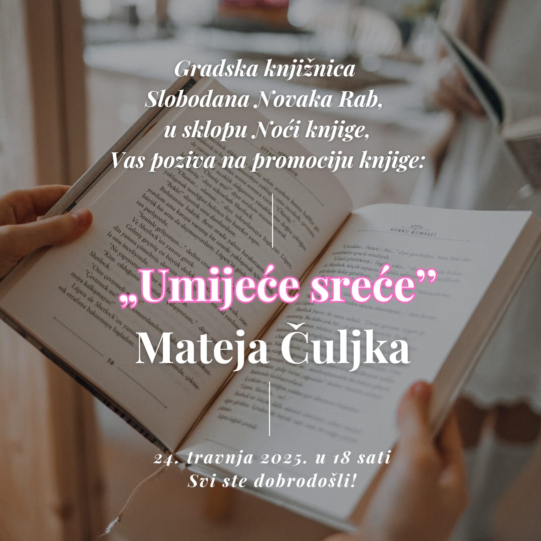 Gradska knjižnica Slobodana Novaka Rab nastavlja s programom Noći knjige u četvrtak, 24. travnja, kada će knjigu Umijeće sreće predstaviti autor Matej Čuljak – psiholog mentor, psihoterapeut u području logoterapije i dječje psihodrame, voditelj programa „Rastimo zajedno“, višestruki otac i – rapski zet.