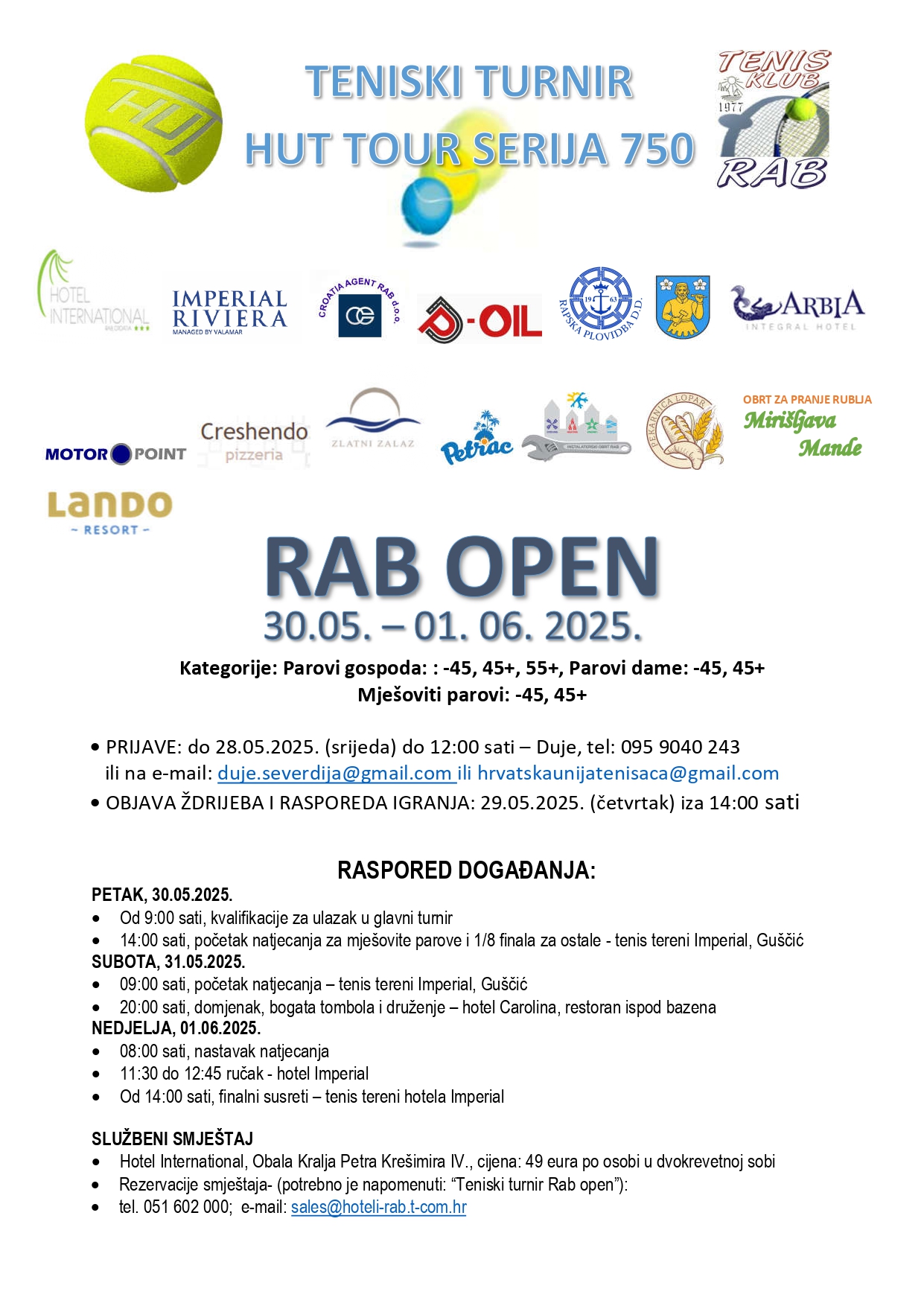 Od 30. svibnja do 1. lipnja 2025. otok Rab će ponovno biti domaćin uzbudljivog teniskog turnira Rab Open, koji se održava u sklopu HUT Tour serije 750. Turnir organizira Teniski klub Rab, a natjecanja će se odvijati na terenima hotela Imperial i u Guščiću.