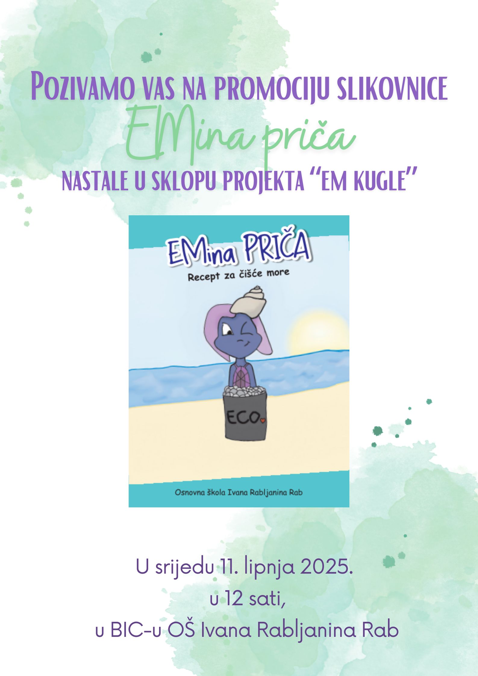 Osnovna škola Ivana Rabljanina Rab i školska Eko grupa s ponosom pozivaju građane i medije na promociju nove edukativne slikovnice “Emina priča – recept za čišće more”, koja će se održati u srijedu, 11. lipnja 2025., u 12:00 sati, u prostorima škole.