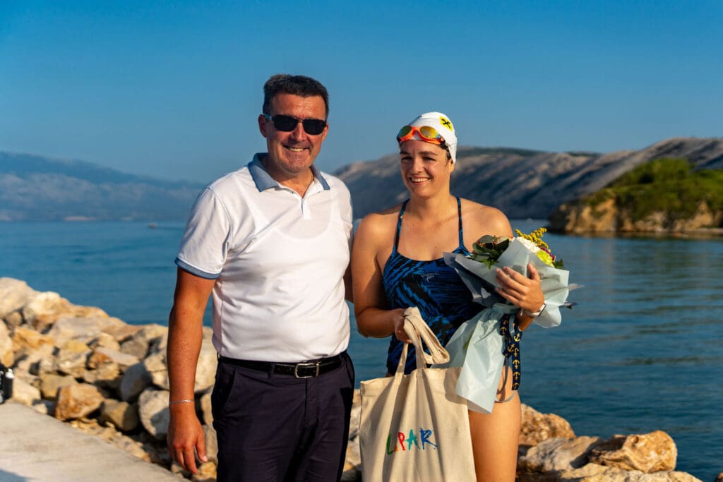 Dina Levačić, jedina Hrvatica koja je preplivala svih velikih sedam plivačkih maratona, jučer je startala iz uvale Vela Draga na Golom otoku oko 16:50, a nakon točno dva sata i isplivanih cca 6 km, spas je našla na zapadnom lukobranu Lučice San Marino u Loparu (Rab).