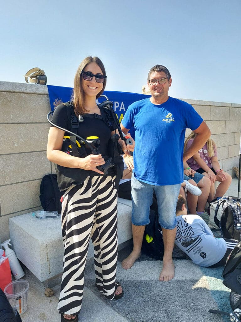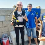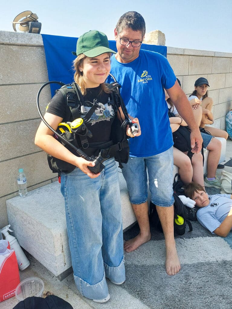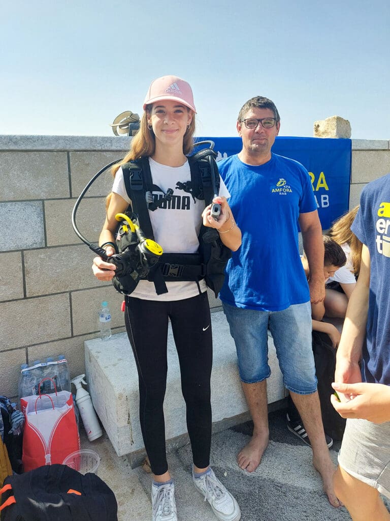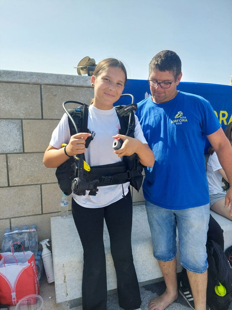 Dok je jedna grupa plovila, drugim je učenicima gospodin Dragan Perkić iz KPA Amfore na zanimljiv način približio ljubav prema ronjenju i morskim dubinama te su učenici mogli isprobati na svojim leđima ronilačku opremu i disanje uz pomoć boce.