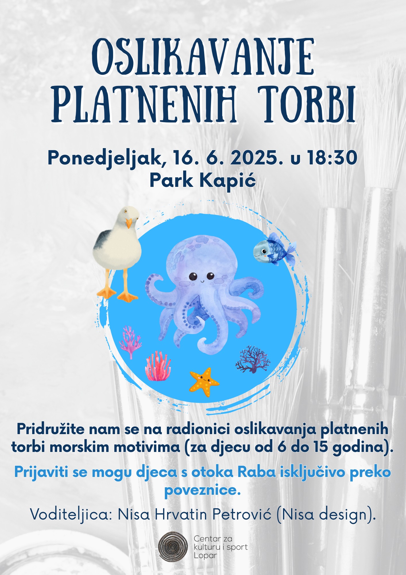 Pridružite se na radionici oslikavanja platnenih torbi morskim motivima (za djecu od 6 do 15 godina), u organizaciji Centra za kulturu i sport Lopar.