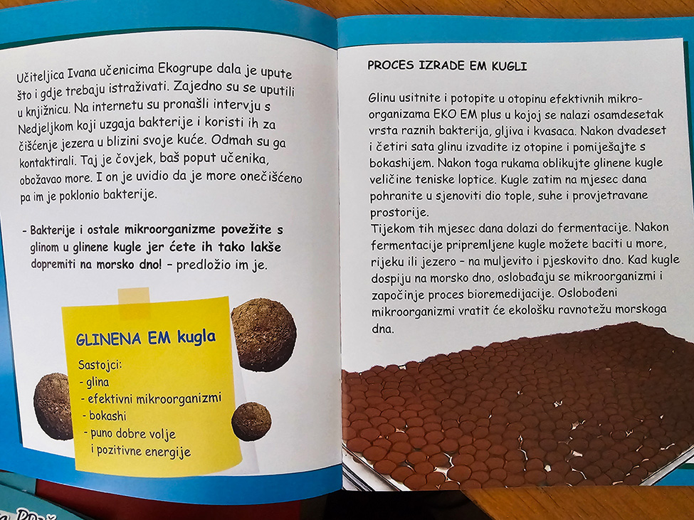 Slikovnica donosi priču o djevojčici Emi koja uz pomoć skupine učenika i još nekih likova, otkriva recept za čišće more. U slikovnici se isprepliću izmišljeni i stvarni likovi, kao i ilustracije i fotografije učenika rapske osnovne škole. Može se stoga reći da je ova slikovnica svojevrsna posveta sad već dugogodišnjem radu školske Ekoskupine i projektu EM kugle. Stručna podrška projektu bio je i NZZJZ od samih početaka.