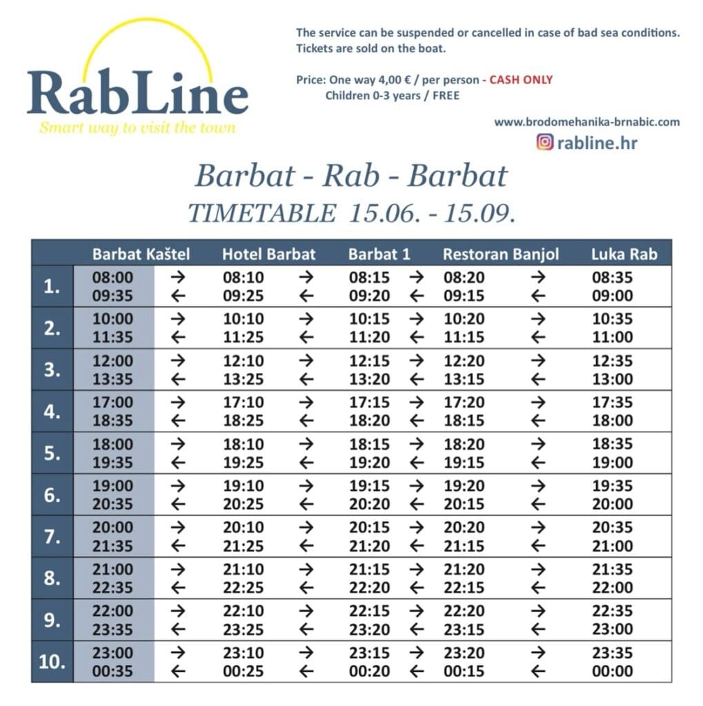 Prema novom rasporedu, RabLine će voziti 10 povratnih linija dnevno s početnom točkom u Barbatu (Kaštel) i krajnjom u luci Rab, a za one koji još ne znaju – usputne postaje za prihvat putnika su još Hotel Barbat, Barbat 1 i restoran Banjol.