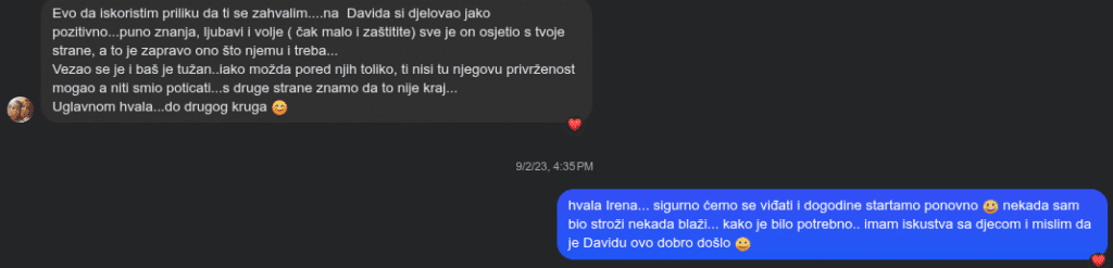 “Evo da iskoristim priliku da ti se zahvalim… Na Davida si djelovao jako pozitivno… puno znanja, ljubavi i volje (čak malo i zaštitite) sve je on osjetio s tvoje strane, a to je zapravo ono što njemu i treba… Vezao se je i baš je tužan… iako možda pored njih toliko, ti nisi tu njegovu privrženost mogao a niti smio poticati… s druge strane znamo da to nije kraj… Uglavnom hvala…do drugog kruga”