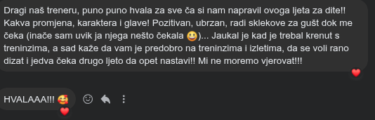 “Dragi naš treneru, puno puno hvala za sve ča si nam napravil ovoga ljeta za dite!! Kakva promjena, karaktera i glave! Pozitivan, ubrzan, radi sklekove za gušt dok me čeka (inače sam uvik ja njega nešto čekala)… Jaukal je kad je trebal krenut s treninzima, a sad kaže da vam je predobro na treninzima i izletima, da se voli rano dizat i jedva čeka drugo ljeto da opet nastavi!! Mi ne moremo vjerovat!!!”