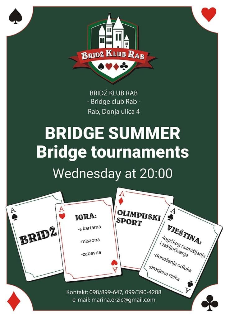 Ljubitelji logičkih igara i kartaških izazova ovog ljeta mogu doći na svoje u samom centru Raba. U organizaciji Bridž kluba Rab svake srijede u 20:00 sati održavaju se bridž turniri u prostorijama kluba na adresi Donja ulica 4, Rab.