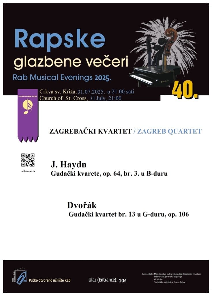 U okviru ovogodišnjih Rapskih glazbenih večeri, u četvrtak 31. srpnja 2025. nastupit će Zagrebački kvartet, najstariji hrvatski komorni ansambl s bogatom međunarodnom karijerom i više od stoljeća umjetničke tradicije.