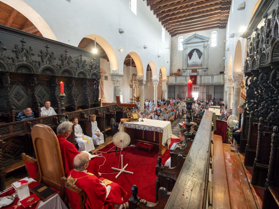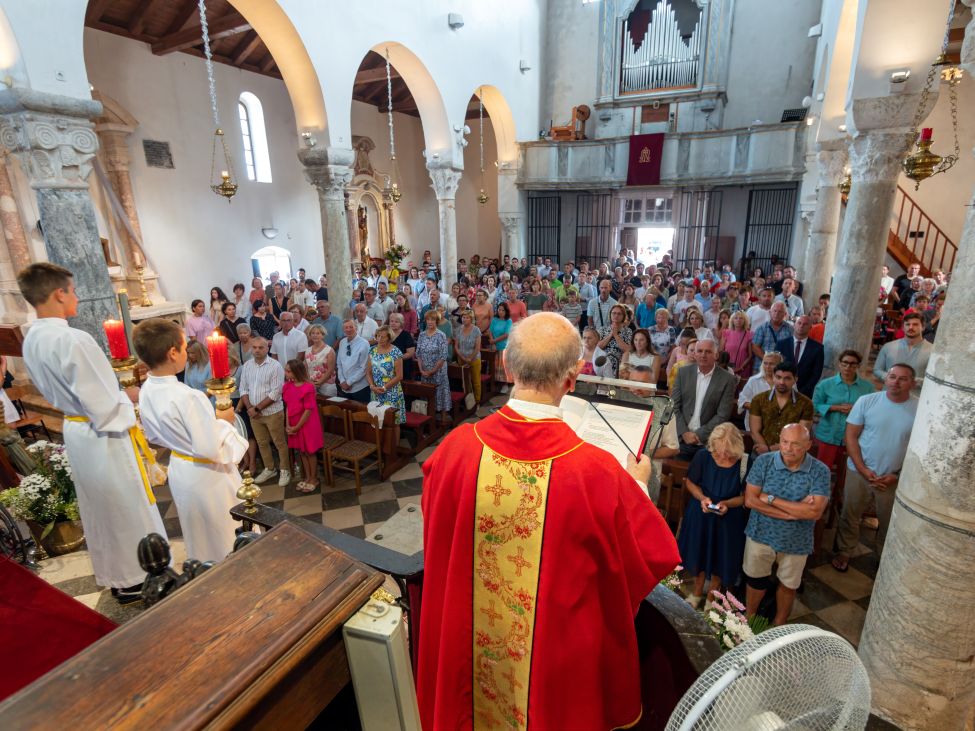 Sunčano jutro 27. srpnja 2025. godine u župi Uznesenja Blažene Djevice Marije donijelo je poseban blagoslov za otok Rab. Nakon noćne kiše, tople zrake sunca osvanule su nad gradom i probudile radost u srcima vjernika koji su se okupili kako bi svečano proslavili blagdan Svetog Kristofora, svog zaštitnika i nebeskog zagovornika.