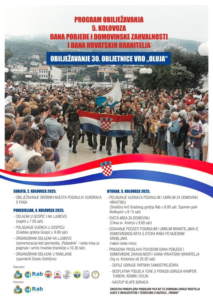 U organizaciji Grada Raba, Turističke zajednice Grada Raba, Udruge dragovoljaca i veterana Domovinskog rata – ogranak Rab, Hrvatskog časničkog zbora – Gradski odbor Rab te udruga Komin, Dolin, Tunera i Kampor tijekom tri dana će se obilježiti 30. obljetnice vojno-redarstvene operacije “Oluja”.