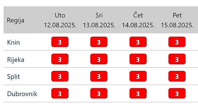 Iako je prvobitno DHMZ zbog visokih temperatura izdao crveni meteoalarm za kninsku, riječku, splitsku i dubrovačku regiju do četvrtka, sada je produžio crveni alarm za iste regije sve do petka, dok za dane vikenda tek trebaju biti određena upozorenja.