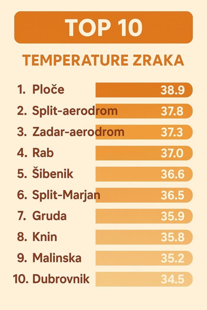 Početak tjedna donio je ekstremne vrućine u Hrvatskoj, a prema podacima DHMZ-a otok Rab je u ponedjeljak bio među dnevnim temperaturnim rekorderima. Inače, najviša dnevna temperatura zraka jučer u 15:00 sati izmjerena u Pločama – 40.1 °C.
