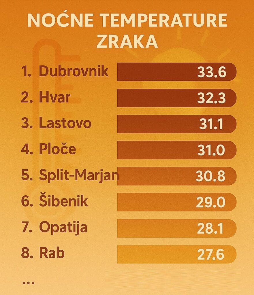 Niti noć nije donijela olakšanje, pa se tako u ponoć primjerice jug Hrvatske “hladio” na +30 stupnjeva Celzijusovih, a prednjačio je Duzbrovnik u kojem je bilo 33,6°C.