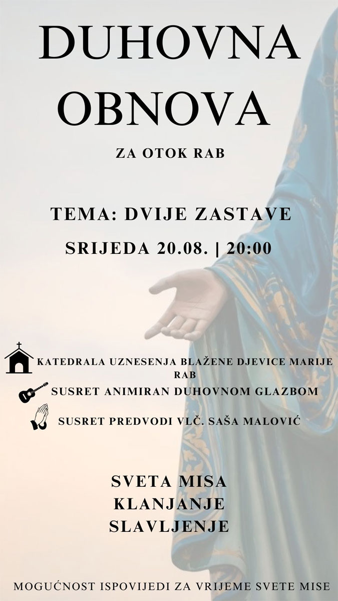 U srijedu, 20. kolovoza 2025. s početkom u 20:00 sati u Katedrali Uznesenja Blažene Djevice Marije u Rabu održat će se još jedan susret duhovne obnove za otok Rab.