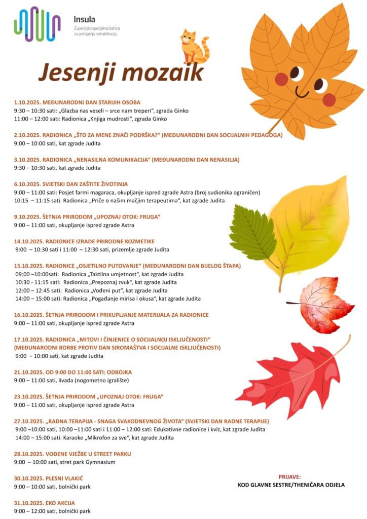 U cilju jačanja psihosocijalnih vještina, poticanja kreativnog izražavanja, razvijanja zdravih životnih navika te uključivanja u zajedničke aktivnosti koje osobama trenutno na liječenju pružaju osjećaj podrške i pripadnosti, jesenje dane obogatit ćemo brojnim aktivnostima.
