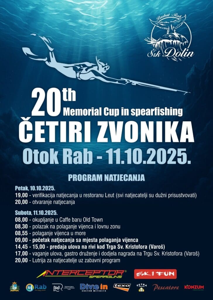 Sljedeći vikend, 10. i 11. listopada 2025. održat će se jubilarni 20. Memorijalni kup u podvodnom ribolovu “Četiri zvonika” u organizaciji Športsko-ribolovnog kluba Dolin iz Barbata.