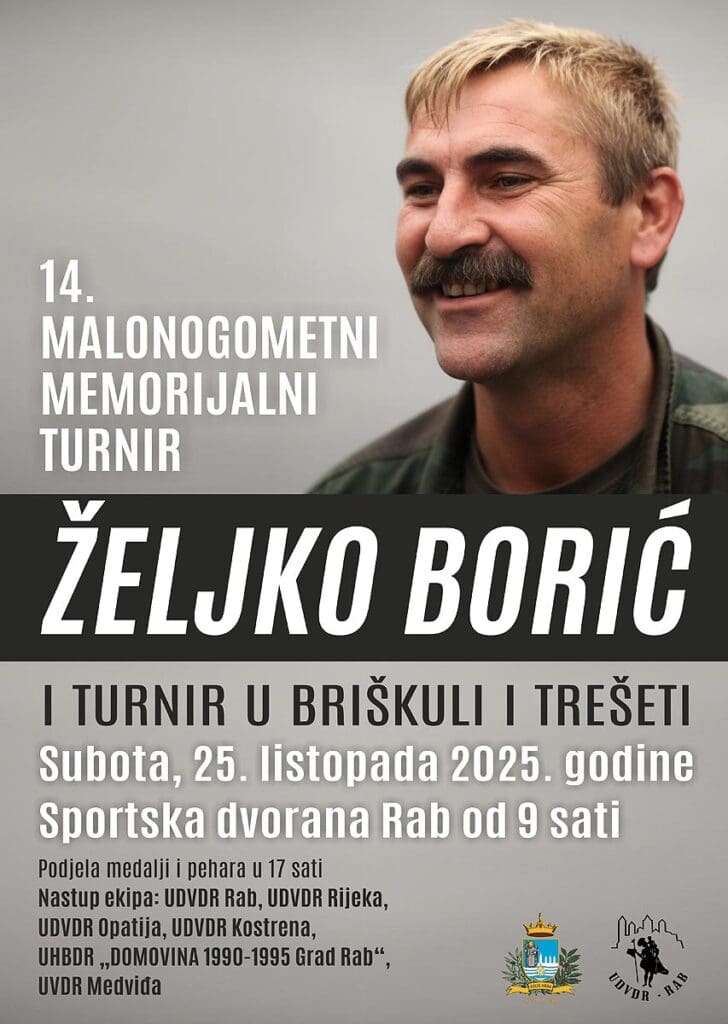 U spomen na poginulog branitelja Željka Borića, ove će se subote, 25. listopada 2025. godine, u Sportskoj dvorani Rab održati 14. malonogometni memorijalni turnir “Željko Borić”, u organizaciji UDVDV-a Rab i Grada Raba.