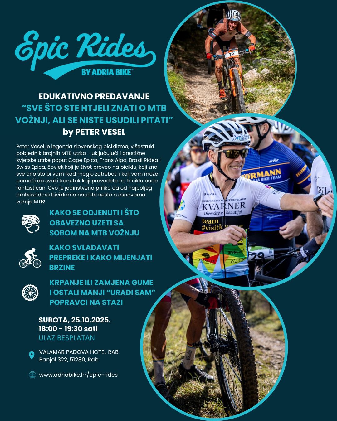 Predavanje je besplatno za sve sudionike Peterovog MTB kampa koji se na Rabu uz potporu Valamar održava od 25.10. do 28.10., za sve sudionike Epic Rides Rab događanja, ali i za sve ostale lokalne zaljubljenike u MTB ili biciklizam općenito.