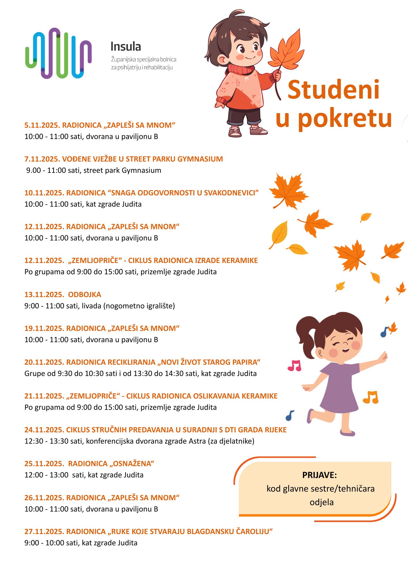 U cilju preuzimanja aktivnije uloge u procesu liječenja i oporavka, uz redovne terapijske programe, u studenome u ŽSB Insula nastavljaju s programom mjesečnih aktivnosti.