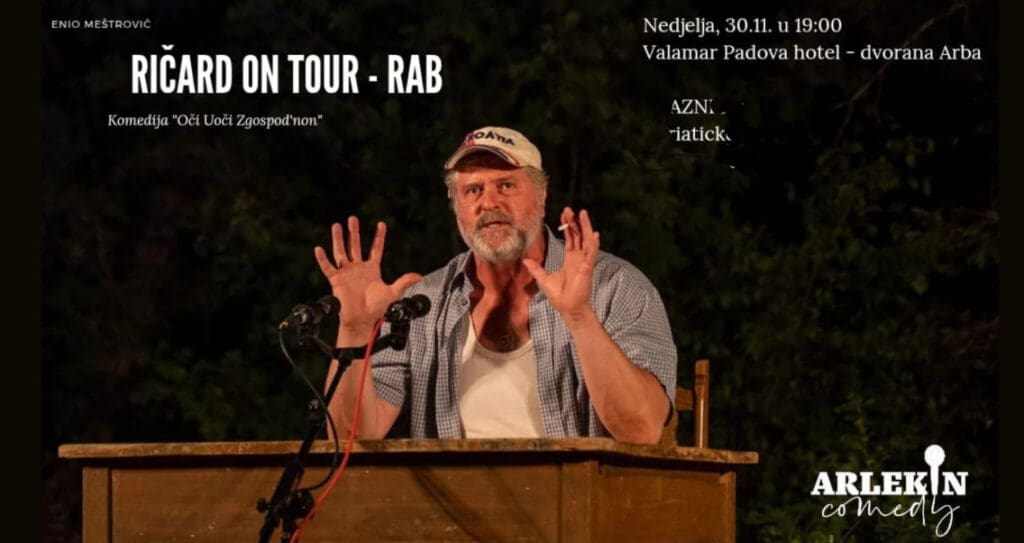 Rapska će publika u nedjelju, 30. studenog 2025. s početkom u 19:00 sati u dvorani Arba, Valamar Padova hotela, imati priliku uživo upoznati legendarnog Ričarda – osebujnog lika kojeg tumači zadarski glumac i performer Enio Meštrović – u predstavi “Oči Uoči Zgospod’non”.