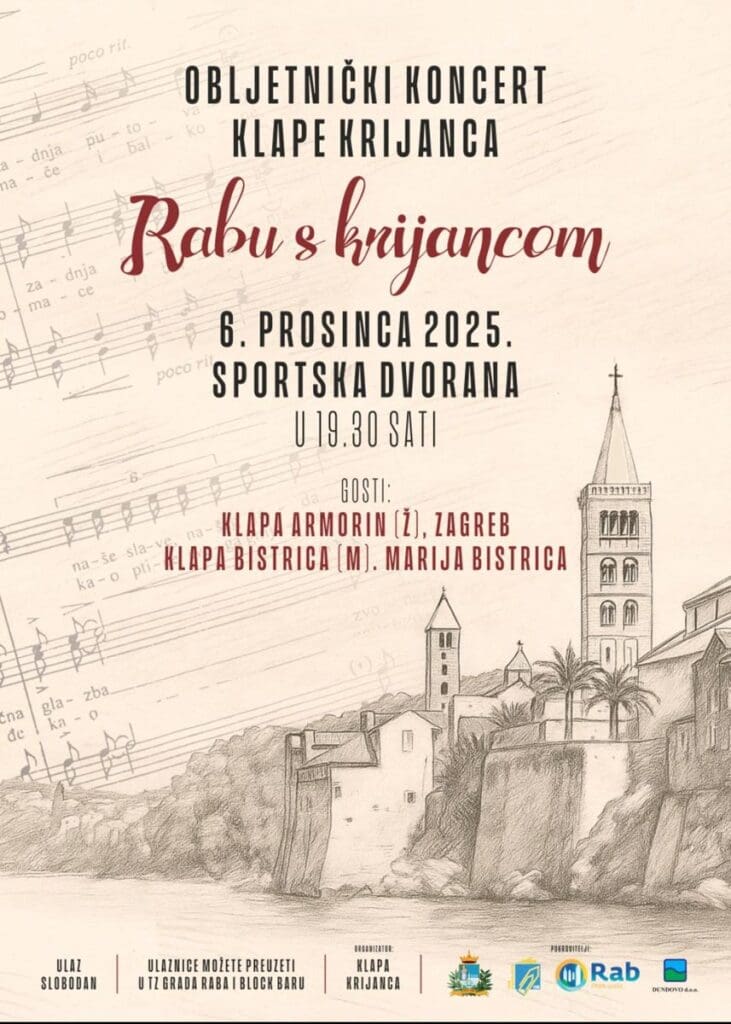 U subotu, 6. prosinca 2025. s početkom u 19:30 sati u Sportskoj dvorani Rab klapa Krijanca slavi svoju obljetnicu posebnim koncertom “Rabu s krijancom”.