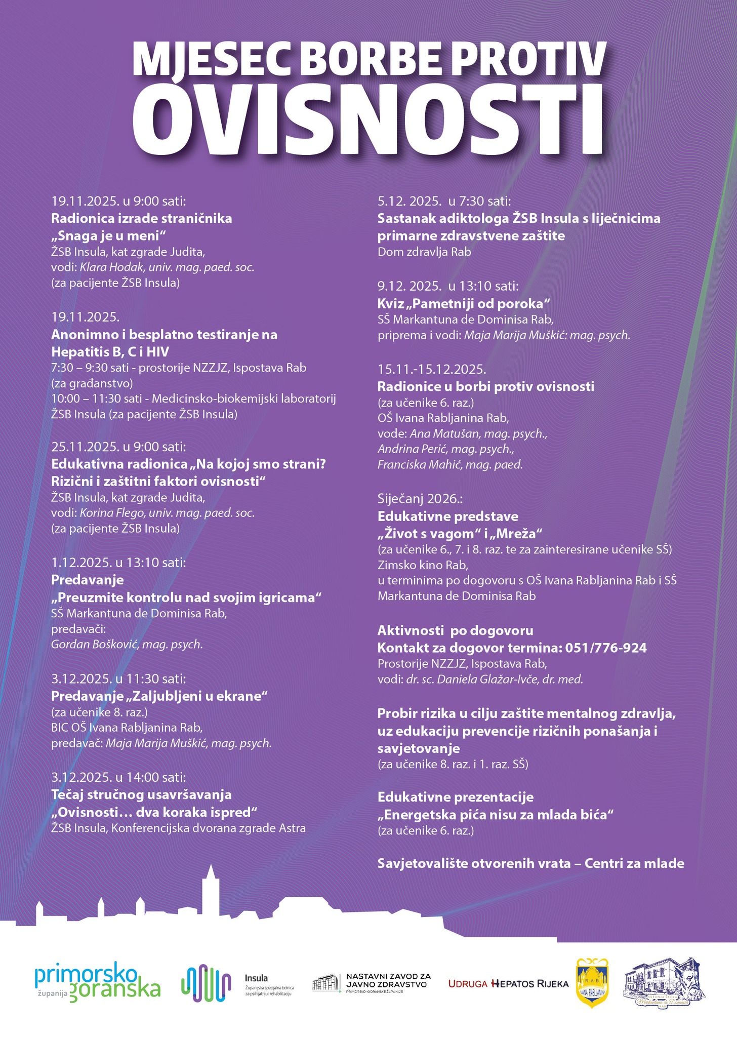 U suradnji s NZZJZ, Ispostava Rab, OŠ Ivana Rabljanina Rab, SŠ Markantuna de Dominisa Rab, liječnicima obiteljske medicine Doma zdravlja PGŽ, Udrugom Hepatos Rijeka i ove godine priprema bogat program koji uključuje niz edukativnih, preventivnih i savjetodavnih aktivnosti koje su namijenjene učenicima osnovne i srednje škole, građanstvu te stručnjacima koji su posvećeni radu s ovisnicima.