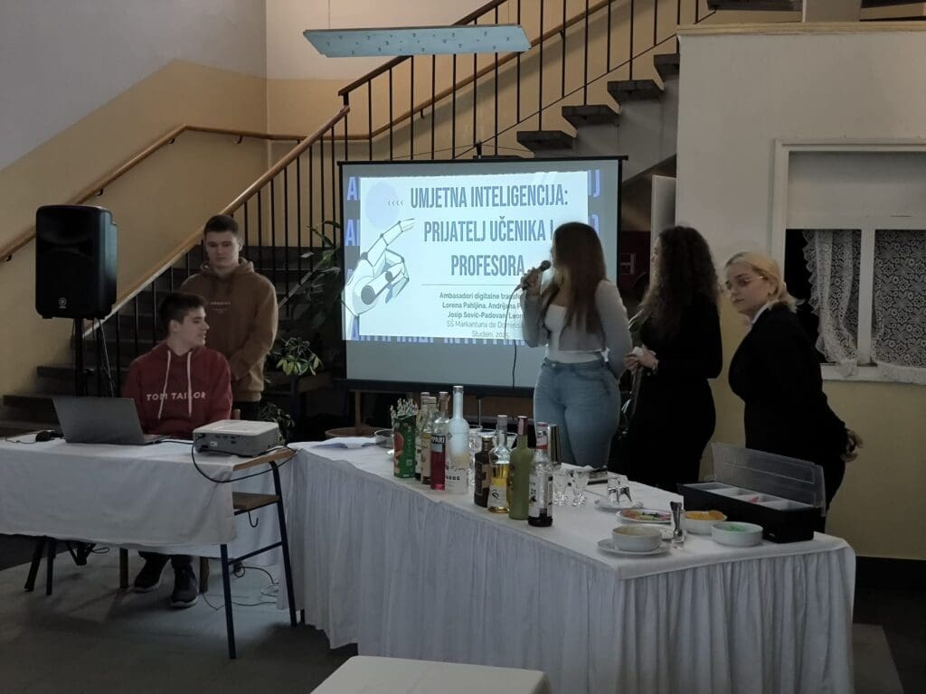 Nakon toga je u školskom holu uslijedio početak programa za učenike i nastavnike – prezentacija o umjetnoj inteligenciji koju su održali učenici maturanti (Andrijana i Lorena Pahljina, te Leon Beg i Josip Sović Padovan; pod mentorstvom prof. Aleksandre Brmbota), STEM pokusi pod mentorstvom prof. Lane Jurković, a koje su izveli učenici gimnazijskih razreda, te kviz u timovima od 5 članova, za nastavnike i učenike, a u kojem je pobjedu također odnio 4.b razred.